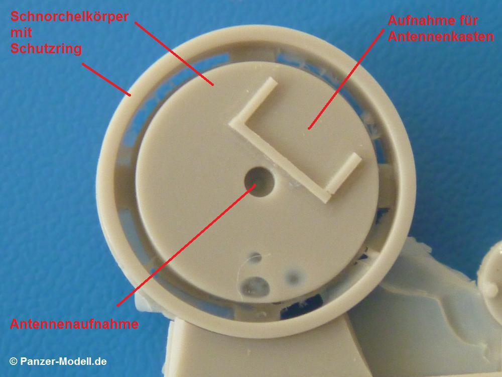 Der Umbausatz: Cyber-Hobby brachte 2012 eine Tauch-Version des Panzerkampfwagen III heraus, wie es sie bei den Vorbereitung des Unternehmens Seelöwe (Landung in England) gegeben hat. Der Bausatz ist mit einer tellerrunden Boje auf einem Standrahmen ausgerüstet, wie man sie auch auf Originalaufnahmen bei den Testläufen sehen kann.Von MR-Modellbau gibt es nun eine andere Version der Boje aus Resin. Insgesamt sind es 5 Teile auf 2 Resinangüssen in einer wieder verschließbaren Plastiktüte, die die Teile Q1, Q9, Q10 und 4x Q19 des Originalbausatzes ersetzen. Die Teile sind sauber gegossen mit Details wie Schweißnähten und Schraubenköpfen. Hier und da sind Lufteinschlüsse zu sehen und ein paar hauchdünne Fischhäute, die sich aber ohne Weiteres entfernen lassen sollten. Am Antennenkasten sind beim Besprechungssatz 2 Schrauben leider nicht voll ausgebildet.Hauptteil ist der kegelförmige Bojenkörper Nr. 1, der am unteren Ende den Schlauchanschluss Nr. 3 erhält. Auf den Schlauch E aus dem Cyber Hobby Bausatz schiebt man den Spannring Nr. 4 auf das obere Ende, bevor man den Schlauch mit dem Schlauchanschluss verbindet. Auf das obere Ende des Bojenkörpers klebt man den Schnorchelkörper mit Schutzring Nr. 2. Hier kommen dann 4 selbstanzufertigende Stützbleche zum Einsatz, die den Schnorchelkörper am Bojenkörper abstützen. Der Antennenkasten Nr. 5 wird auf die markierte Fläche des Schnorchelkörpers geklebt. Zum Schluss wird die Antenne in das Loch am Schnorchelkörper gesetzt.Die Antenne und die 4 Stützbleche des Schnorchelkörpers sind nicht im Umbausatz enthalten. MR empfiehlt hierfür die Verwendung der Evergreen Produkte Nr. 221 (Rundmaterial Ø 1,25 mm für Antenne) und Nr. 103 (Profil 0,5 x 1,5 mm)Die einseitige Bauanleitung zählt die 5 Teile in Deutsch und Englisch auf. Ein Photo zeigt den oberen Teil der Boje in zusammengesetztem Zustand. Zeichnungen der Einzelteile in der Reihenfolge des Zusammenbaus stellen die Anleitung dar. Bemalungshinweise konnte ich keine finden. Auf der MR Internetseite findet man ein Foto, auf dem man die komplette Boje zu sehen bekommt.Für ca. 8,00 EUR bekommt man einen netten Umbausatz, mit dem man seinen Tauchpanzer III von der Masse etwas abheben kann. |