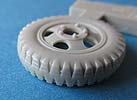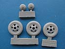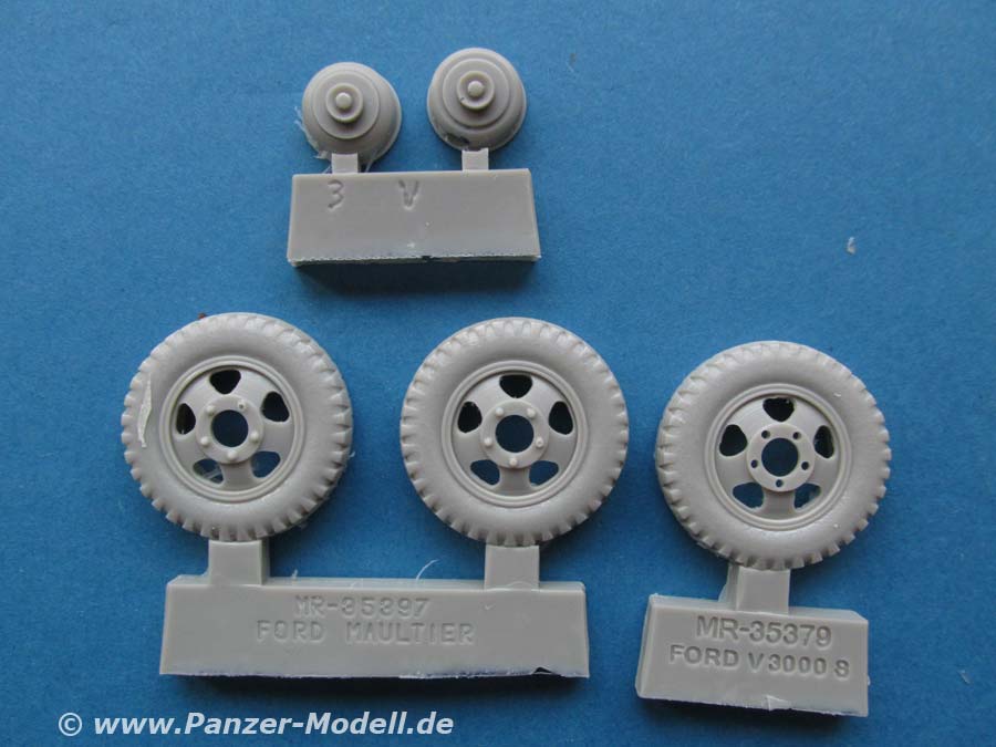 Dabei handelt es sich um schöne Vorderräder für das Maultier, sowie ein entsprechendes Reserverad. Für die Vorderräder liegen zusätzlich die passenden Bremstrommeln bei, die zusammen mit den Rädern eine perfekte Darstellung bieten.