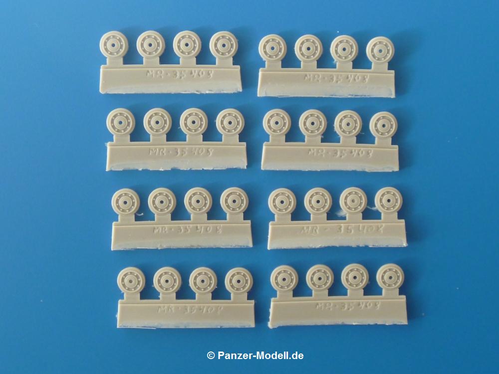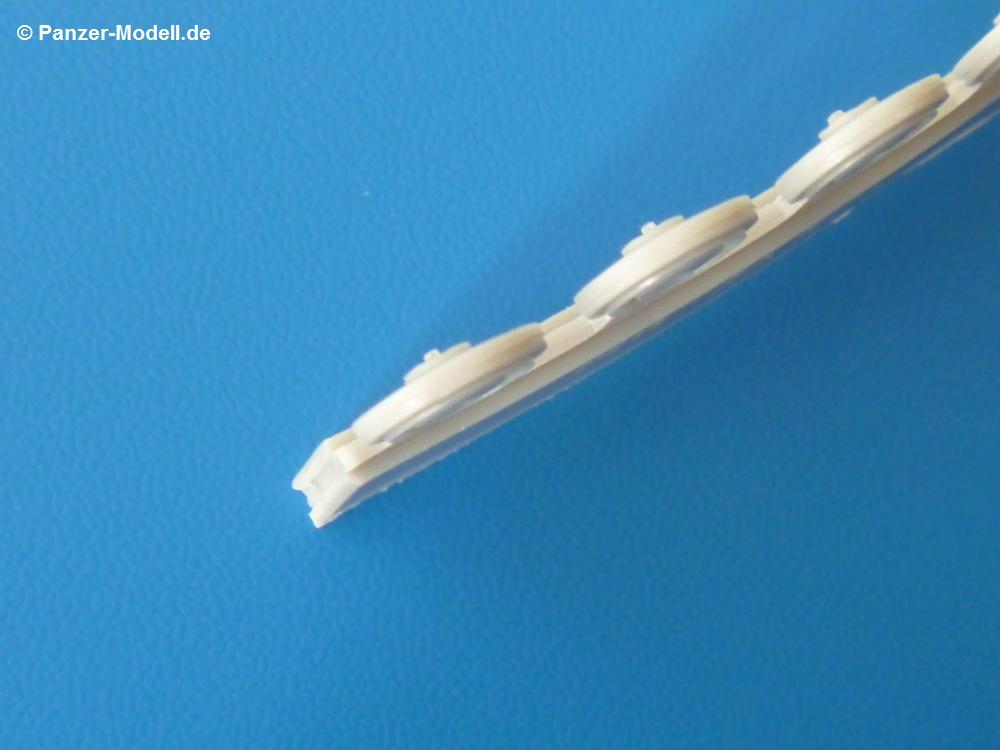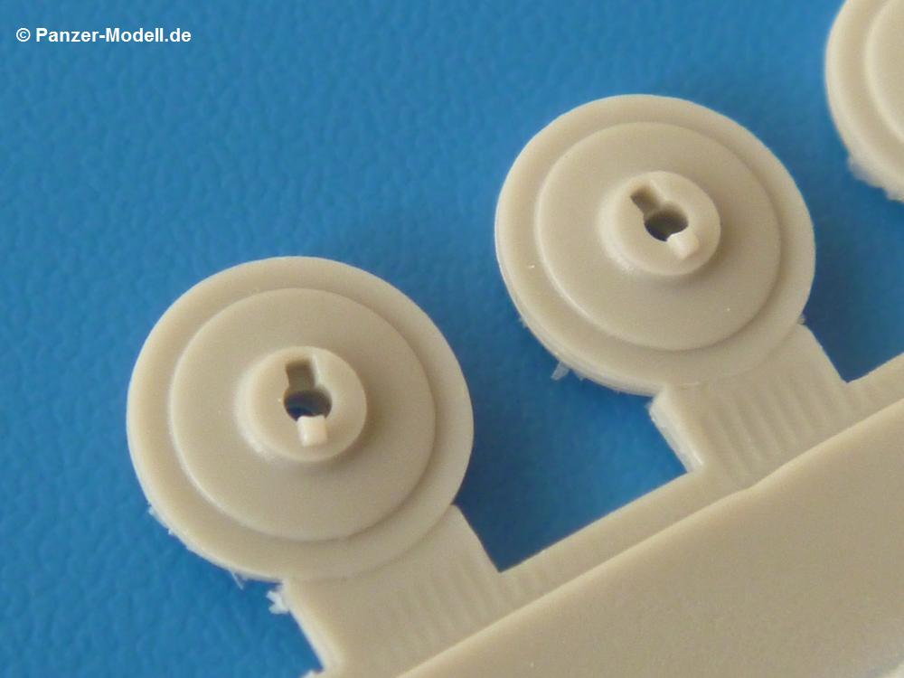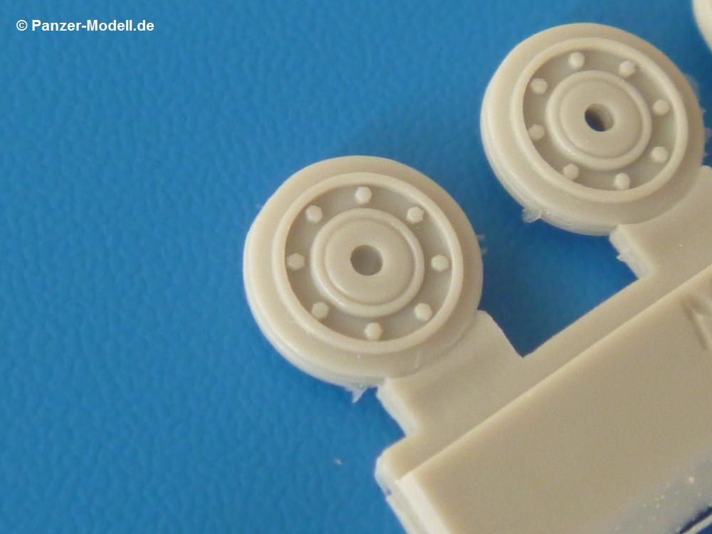 Der Umbausatz: Hobby Boss hat mittlerweile so einige T-26 in 1:35 auf den Markt gebracht.MR-Modellbau beschert uns einen Satz später Laufrollen passend für diese Modelle. Die 32 Laufrollen finden wir auf 8 Resinangüssen zu je 4 Laufrollen. Blasenfrei und mit sehr schönen Schraubenköpfen eine willkommene Aufwertung.Für ca. 12,00 EUR im Handel erhältlich.