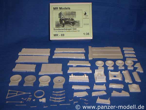 Generatoranhänger von FCM haben wir ja bereits besprochen, heute stellen wir Ihnen den Sonderanhänger Ost vor. Als einfacher Anhänger für die schwierigen Witterungsbedingungen im Osten konzipiert, bildet dieser 1,5t Anhänger ein ideales Gespann mit Italeris Raupenschlepper Ost. Der Sonderanhänger Ost ist normalerweise mit vier großen Stahlfelgen ausgestattet und für eine Marschgeschwindigkeit von grade einmal 8 km/h ausgelegt. Es wird vermutet, daß die Sonderanhänger Ost auch mit normalen Luftdruckreifen gefahren wurden, also liegen diese dem Modell optional bei. Die Qualität ist gut, die teile weitestgehend blasenfrei und sauber gegossen. Lediglich die flachen Seitenteile sind etwas gebogen, das sollte sich aber über etwas Wasserdampf richten lassen. Neben Resin Teilen verfügt das Modell auch über eine stattliche Zahl von Metallteilen, auch hier ist die Qualität exzellent. Meiner Meinung nach ist der Sonderanhänger Ost eine Bereicherung für jeden Fuhrpark und vorallem mal eine willkommene Anhängelast, wenn man nicht immer nur Kanonen oder Nebelwerfer anhängen möchte.