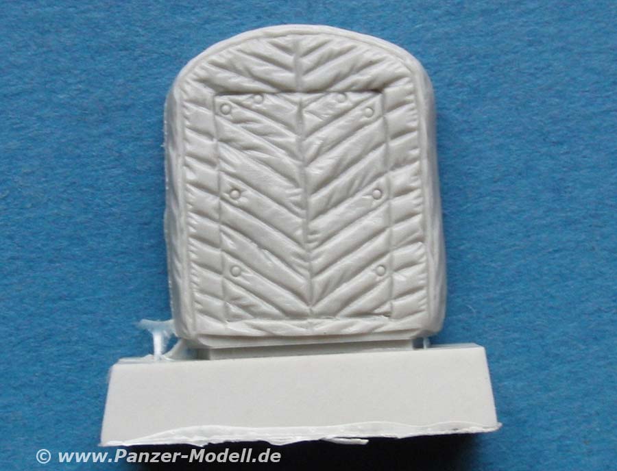 Der Guss ist wie gewohnt sehr gut und die Details sehr schön herausgearbeitet. Dabei gibt es Nahtrillen und kleinere Fältchen zu sehen, wie auch den sehr schön dargestellten eingeknöpften Einsatz, der Zugang zur Kühlermaske ermöglicht. Selbst die kleinen Knöpfe sind sehr gut und fein dargestellt.