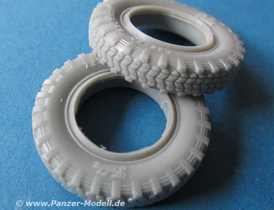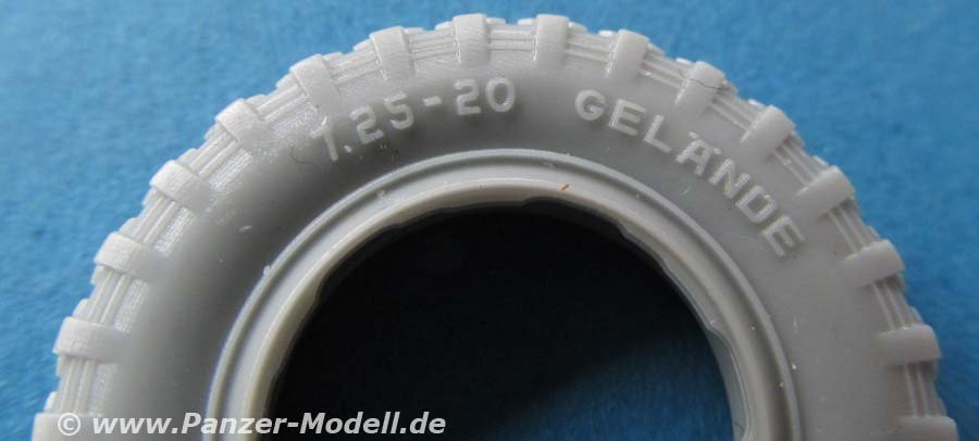 Der Guss der ist ausgezeichnet und sehr sauber. Die Reifen an sich kommen ohne Anguss, zeigen aber im Innenteil ein kaar kleine Gussfetzen, die schnell beseitigt sind. Die Details der Reifen sind phänomenal. Das Reifenprofil und die Wulstung der Flanke sind sehr gut und die Herstelleraufdrucke sind sensationell dargestellt - sauber und fein detailliert. Es handelt sich hierbei übrigens um Fulda Geländereifen.