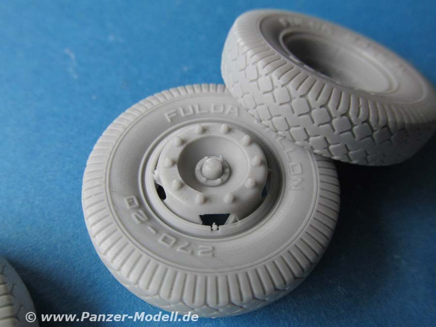 Dieses Set beinhaltet neun Resinbauteile für die Bereifung des Mercedes 4500.