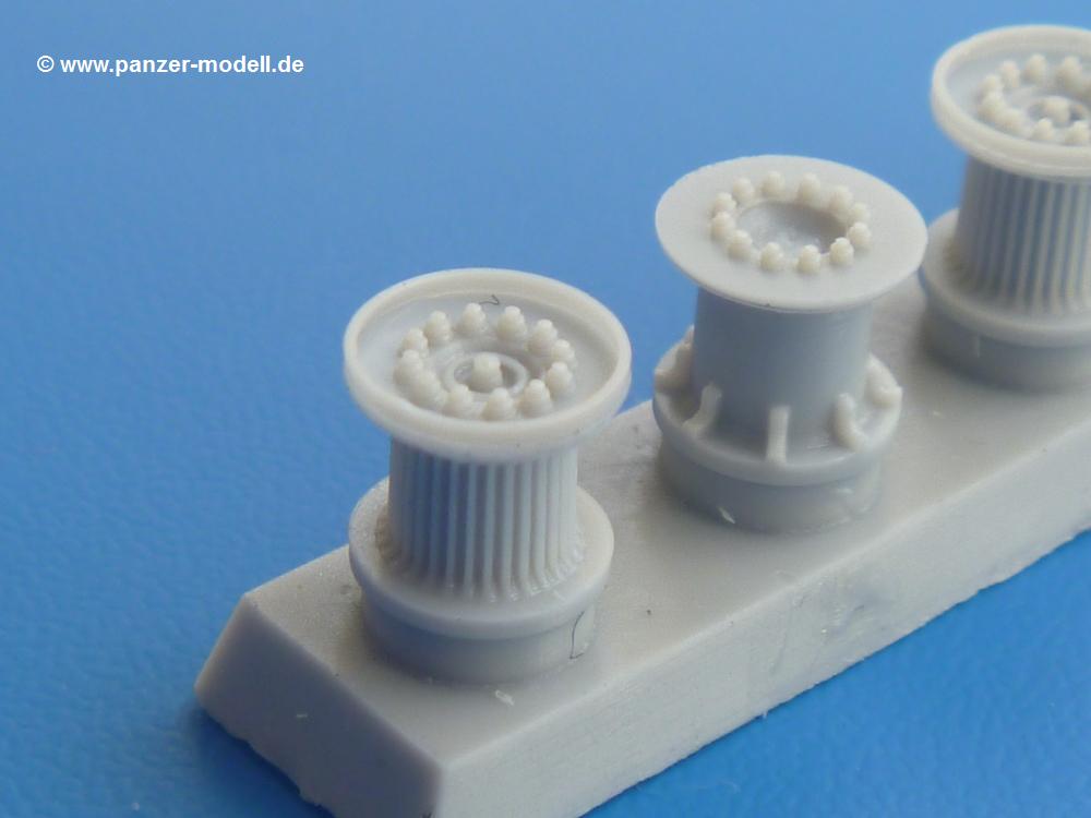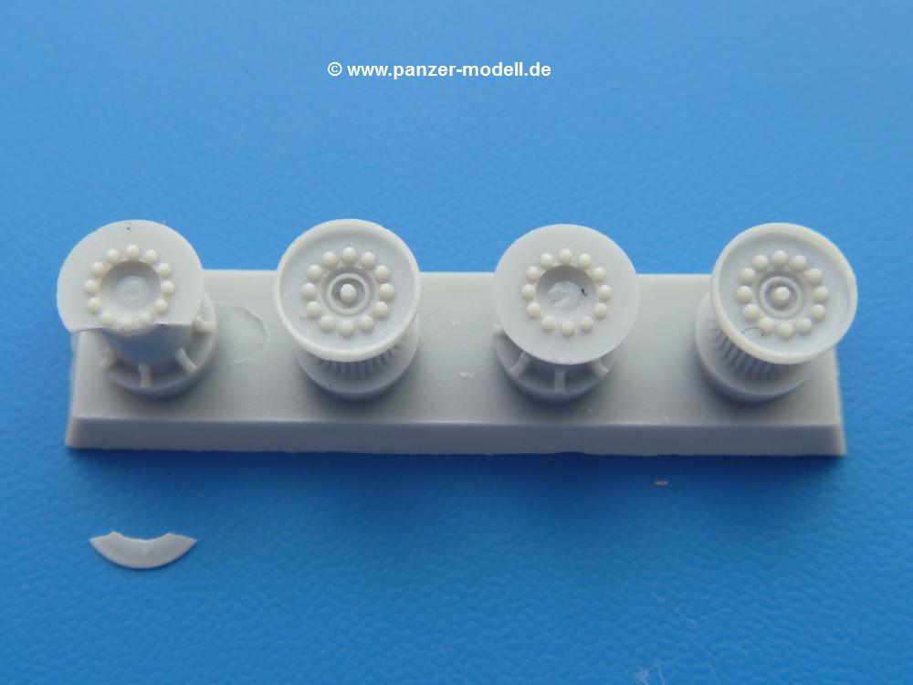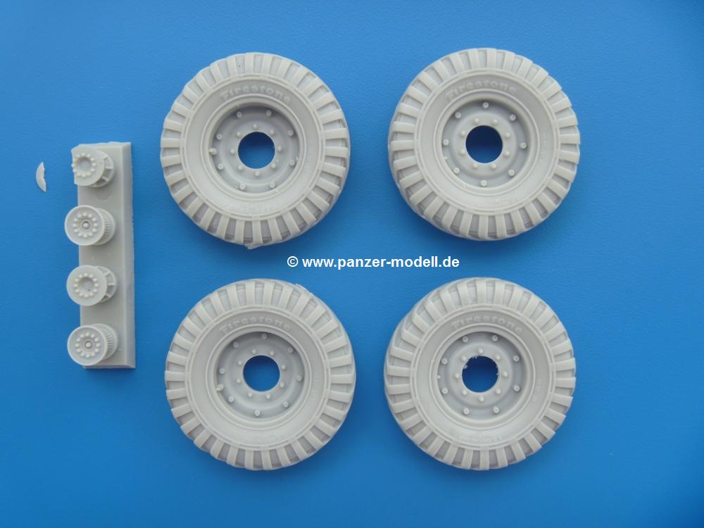 Das Original: Firestone wurde von Harvey Samuel Firestone (Nachfahre von elsässischen Einwanderern mit Namen Feuerstein) 1900 in Akron, Ohio/USA gegründet und gilt als einer der Pioniere der Massenproduktion von Reifen. Harvey Firestone nutzte seine Freundschaft zu Henry Ford, um Zulieferer für die Ford Werke zu werden. Die berühmten Ford T-Modelle wurden werkseitig mit Firestone Reifen ausgerüstet. Die Firestone 10.50-20 fanden unter anderem Verwendung auf alliierten Fahrzeugen im 2. Weltkrieg. Die Maße werden auf den Reifenflanken meist mit erhabenen Zahlen/Buchstaben angegeben wie auch heute immer noch üblich. Im vorliegenden Fall beziehen sich die Angaben auf den Reifen auf die Breite und der Felgendurchmesser jeweils in Zoll. 10.50 - 20 bedeutet also 10,5 Zoll breit, Felgendurchmesser 20 Zoll. Der Umbausatz: Öfter hat man im Internet schon lesen können, dass die AVON Reifen auf Bedford QL Lkws von IBG Models Nachkriegsausführungen sein sollen. Panzer Art liefert uns nun einen Satz von 4 Firestone Reifen mit Felge + Radnaben, die auf alle Fälle für einen QL im 2. Weltkrieg verwendet wurden. Die Räder sind sauber gegossen, ohne Luftblasen, Gießfehler oder Grat. Leider war beim Besprechungsmuster der dünne Rand einer Radnabe abgebrochen. Dies ist aber ein Ausnahmefall und lässt sich leicht reparieren. Die Räder sind ohne Angussstück und müssen nur minimal versäubert werden. Auf einem Block sitzen die 4 Radnaben. Vorsicht beim Absägen wegen den feinen Nabenrändern. Panzer Art hat das V-förmige Profil der Reifen gut getroffen. Alle Reifen sind an einer Seite etwas abgeflacht, um das Fahrzeuggewicht darzustellen. Auf den Reifenflanken innen wie außen erscheint der typische Firestone Schriftzug in erhabenen Buchstaben. Die Reifengröße 10.50-20 ist ebenso vorhanden wie C.C. Ground Grip und One (Symbol dazwischen) One. Details wie die Schrauben der Felgen und Ventil sind gestochen scharf. Gleiches kann man von den Radnaben sagen. Ein sichtbare Aufwertung für einen Bedford QL Bausatz. Für 11-12 Euro sind die Räder im deutschen Handel erhältlich.