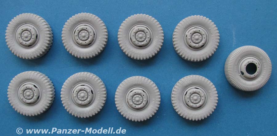 Dieses Set beinhaltet neun Resinteile für die Reifen mit Reservereifen für die Sd.Kfz.234 Reihe.