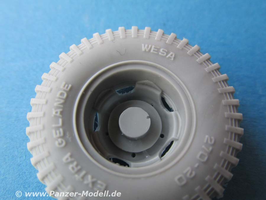 Die Felgen sind sehr gut und fein detailliert dargestellt. Die 5 länglichen Schlitze sind ebenfalls gut und offen dargestellt. Das Reserverad ist mit leerer Felge für die Radnabe gegossen und macht einen ausgezeichneten Eindruck.