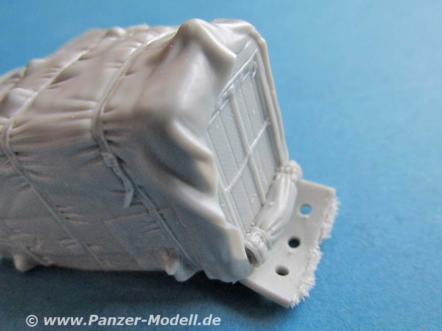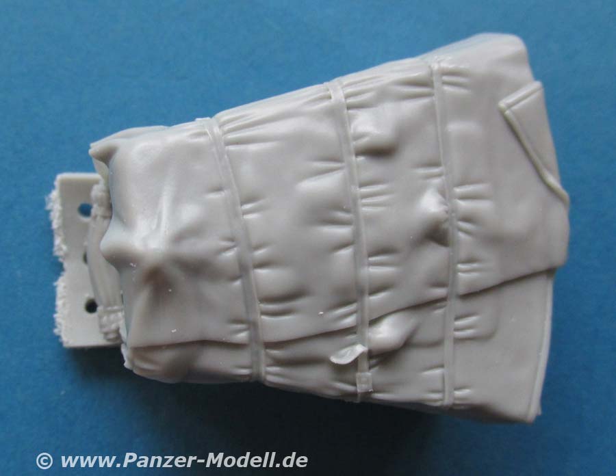 Der Guss des Bauteils ist sehr gut! Wie gesagt in einem Stück gegossen, völlig luftblasen- und verzugsfrei. Ein Kleiner Anguss vorn an der Unterseite und dazu ist die Darstellung der Abdeckplane und des Kühlerschutzes ausgezeichnet. Tolle Details mit so vielen Feinheiten, Zurrgurt mit Schnalle, Kleine Knöpfe und ein realistischer Faltenwurf sowie eine Darstellung des Kühlers mit heruntergerollter Verkleidung..