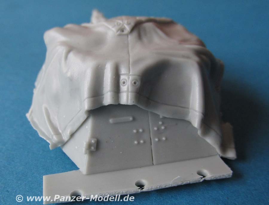 Der Guss des Bauteils ist ausgezeichnet! Wie gesagt in einem Stück gegossen, völlig luftblasen- und verzugsfrei. Ein überschaubarer Anguss hinten an der Unterseite und die Darstellung der Abdeckplanen sind grandios. Tolle Details mit vielen Feinheiten und der realistische Faltenwurf der Zeltplanen sind ein optischer Leckerbissen.