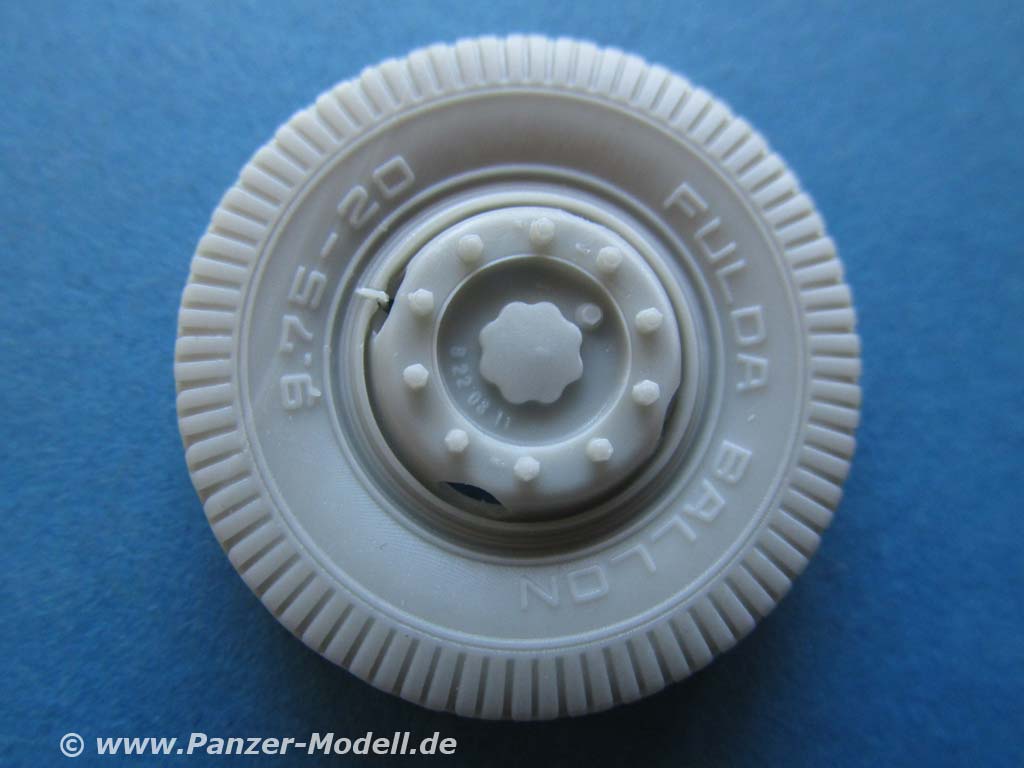 Im Karton finden wir 8 Resinteile für die einzelne Vorderrad und Zwillinghinterbereifung. Leider fehlt dem Set ein Ersatzrad für den Bausatz.