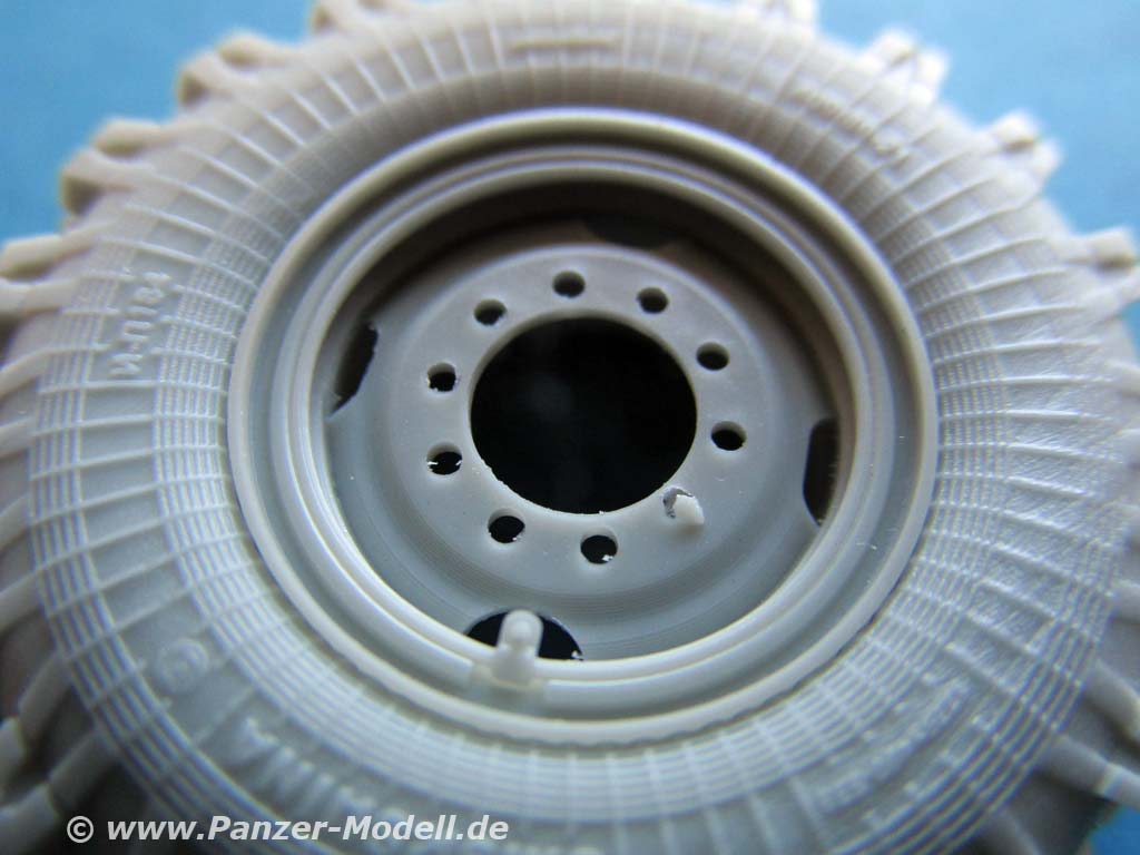 Der Ersatzreifen ist mit leeren Felge und freiliegendem Ventil dargestellt. Hier zeigen sich winzigste Resinunsauberheiten in den einzelnen Löchern und Aussparungen, die aber schnell versäubert sind.