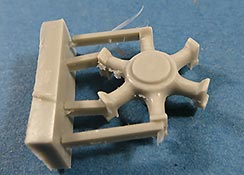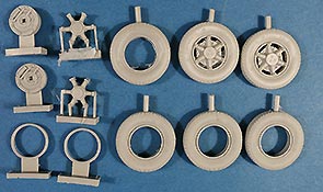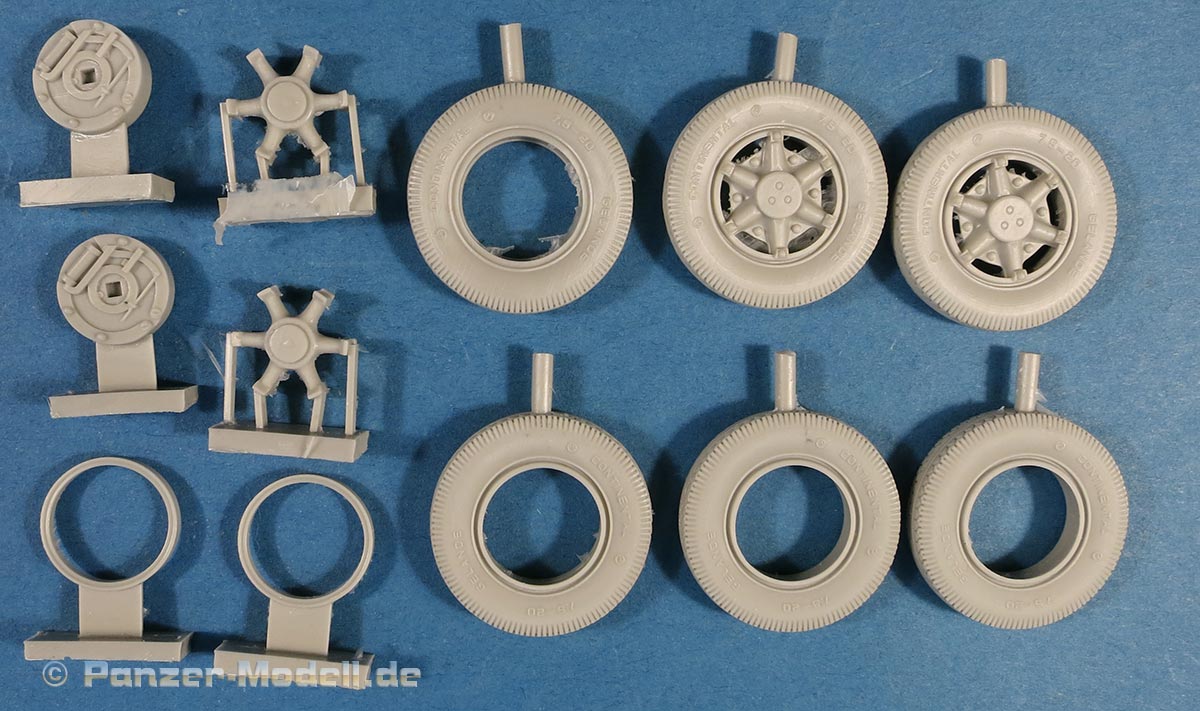 Die Vorderräder sind bereits komplett mit Felge gegossen, die Zwillingsreifen der Hinterachse einzeln als Reifen plus Sternfelge und Felgenring, sowie zwei Bremstrommeln.