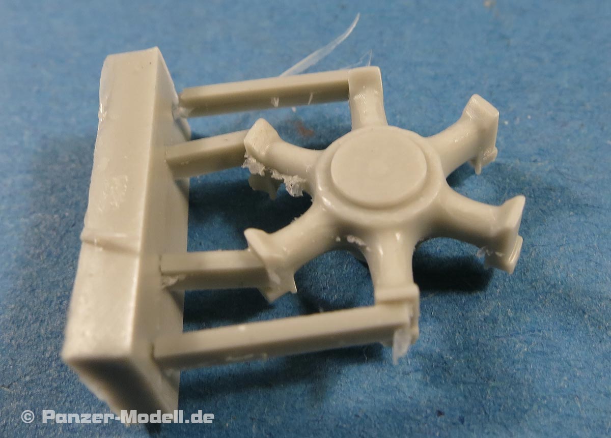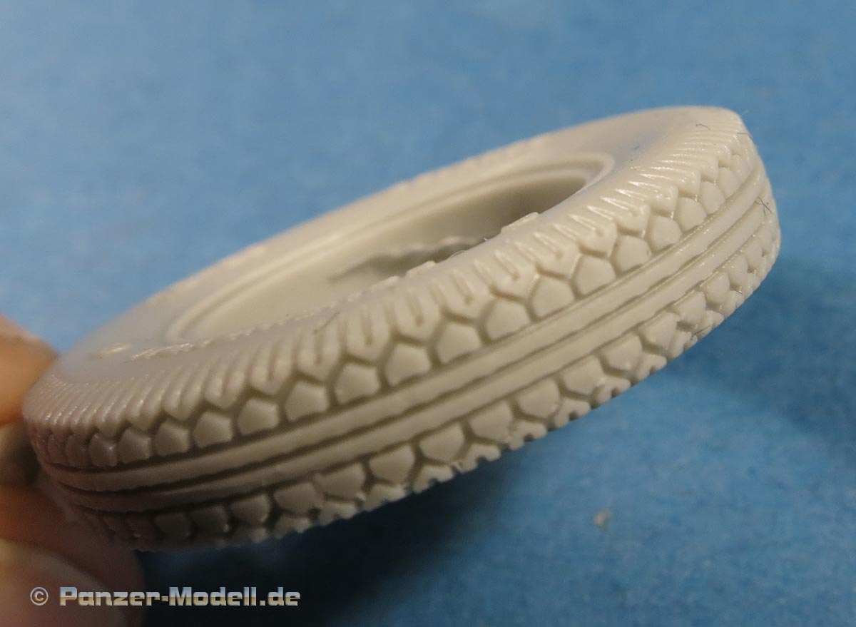 Der Guss der Reifen ist einwandfrei und ohne Luftblasen. Die Detaillierung is phänomenal gut und das bei nur einem relativ kleinen Anguss auf der Lauffläche, der sich sicher leicht versäubern lässt. Zwischen den Felgenspeichen findet sich etwas Fischhaut, die aber auch im handumdrehen versäubert ist.