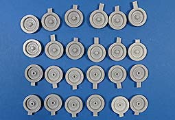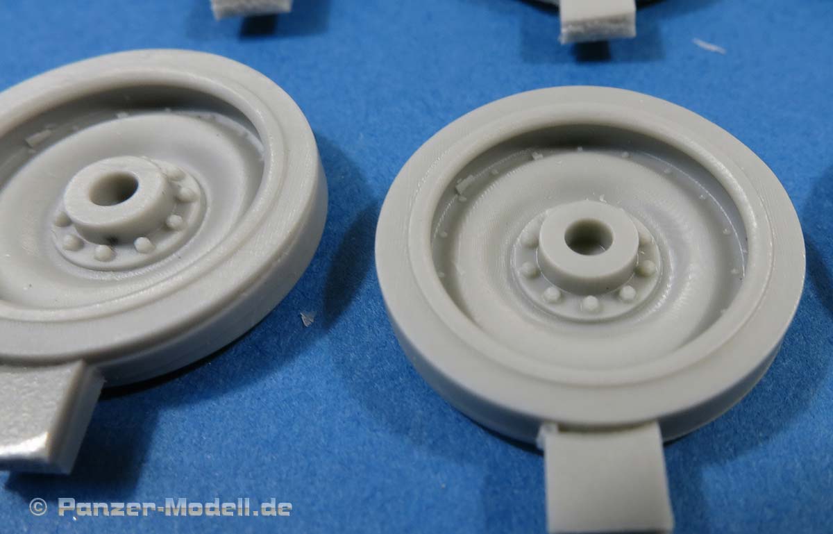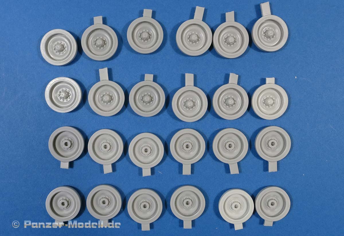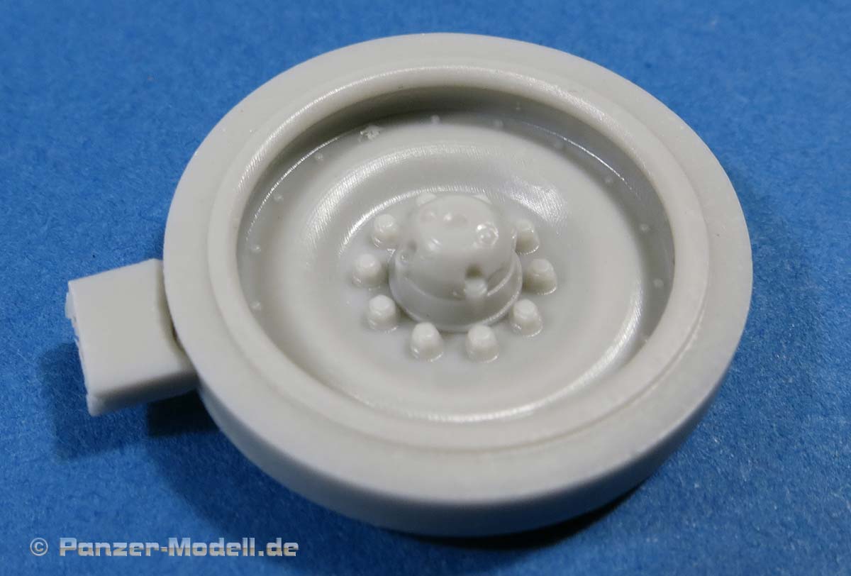 Die Gussqualität ist ganz hervorragend. Sauber, luftblasenfrei und ohne Verzug. Dazu sehr schöne und feine Details, die wirklich zu gefallen wissen, wie die sauberen, scharfkantigen Radmuttern, die Radnabe und vor allem der hinterschnittene Felgenrand mit hauchfeinen Bolzen. Das sieht richtig, richtig gut aus. Ein sehr schöner Satz, der die Bradley Modelle mit schönen, neue, detaillierten Laufrollen versieht. Und wenn mich nicht alles täuscht, dürften die Laufrollen auch auf die M270 MLRS/MARS Raketenwerfer passen.