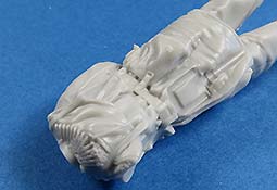 Der Körper ist im Groben in einem Teil gegossen - es nuss nur noch ein Arm, eine Hand, einer der Köpfe und weiteres Zubehör wie Klappspaten, Trinkflasche und ein MG Ersatzlauf angebracht werden. Zusätzlich liegen ein Karabiner und Munitionsboxen für MG Munition als Einzelteile bei.