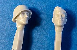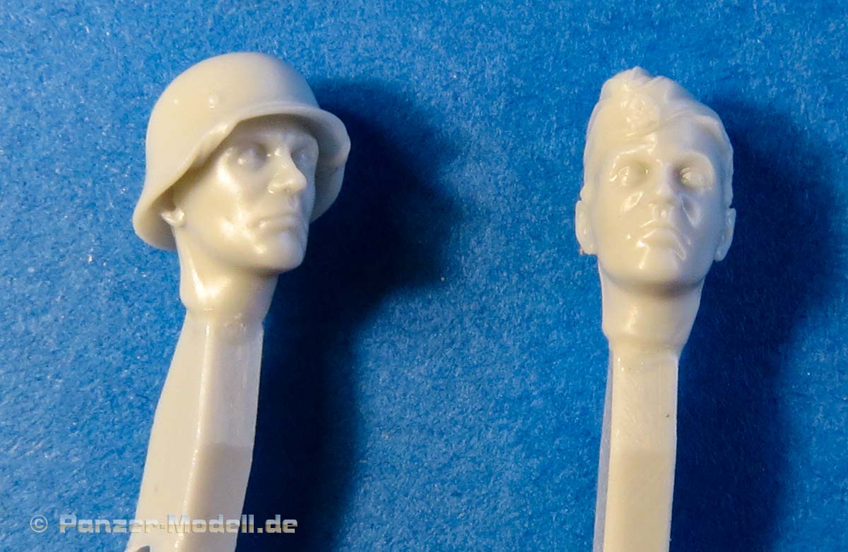 Die Köpfe sind sehr gut - schon die Auswahl aus zwei Köpfen und dann noch in dieser ausgezeichneten Qualität ist wirklich gelungen. Ein Kopf ist mit Stahlhelm gegossen und einer mit Schiffchen. Und auch die Darstellung der Gesichter ist sehr realistisch und ausdrucksstark detailliert gelungen.