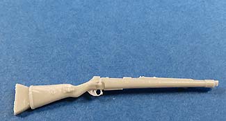 Der Karabiner selber ist sehr schön und detailliert gegossen. Dieser kann wie auf dem Deckelbild an die rechts Hand die einzeln an den angegossenen rechten Arm angeklebt sind angefügt werden.