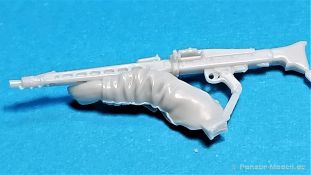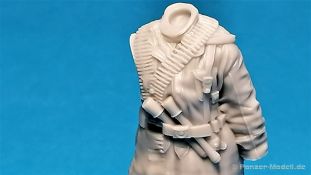 Die kleine Kartonbox beinhaltet rund 22 Resinteile zum Bau von zwei Figuren. Dargestellt sind Schütze 1 und Schütze 2 eines MG Trupps der Waffen-SS. Beide Soldaten sind in Resin gegossen und das in einer sehr schönen Qualität. Die Kameraden kommen im Anorakanzug daher, der schöne Strukturen aufweist. Der Faltenwurf kann überzeugen. Das gilt auch für das Schuhwerk. Im Anorak passend angeformte Vertiefungen nehmen verschiedenen Ausrüstungsteile wie Klappspaten, Trinkflaschen, Pistolenhoster etc. auf. Vier Köpfe finden sich ebenfalls. Zwei Köpfe haben einen Stahlhelm. Schiffchen zieren die zwei anderen. Realistisch und ausdrucksstark realisiert zeigen sich auch die Gesichter. Die Körper sind grösstenteils in einem Teil gegossen. Schön gemacht auch die mit angegossenen MG-Gurte, die für meinen Geschmack etwas prägnanter hätten ausfallen dürfen. Mal wieder jammern auf hohem Niveau… J Beim Schützen 1 ist das MG, das ebenfalls einen sehr guten Eindruck hinterlässt, bereits am rechten Arm angegossen. Sehr gut gemacht. Eventuell sind am MG noch Riemen zu ergänzen. Top auch die Handgranaten die anmodelliert sind. In der linken Hand trägt er einen Munitionskasten. Schütze 2, in einer entspannten Haltung stützt sich mit der rechten Hand auf einen Karabiner und mit der Linken auf eine Munitionsbox. Die Posen erinnern mich etwas an die Kits von „Alpine“. Ein bisschen statisch. Andererseits sind sie dadurch vielfältig einsetzbar. In der Gesamtheit ergänzen sich die Figuren perfekt. Für mich ein hervorragendes Set mit toller Qualität.