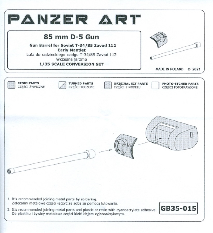 PanzerArt bietet uns hier ein Set aus Rohr und Blende für einen T-34/85, der ca. Januar bis März 1944 gebaut wurde. Da die vorgesehene S-53 Kanone noch nicht fertig entwickelt war, wurden die ersten Fahrzeuge mit der vorhandenen D-5 Kanone ausgestattet. Die Blende aus Resin hat eine saubere Struktur mit Löchern für Zielfernrohr und koaxiales MG. Die Ränder sind mit schweißbrenner-typischer Oberfläche gestaltet. Sehr gelungen sind auch die 4 vertieften Blendenverschraubungen. Das Alu-Rohr ist schnurrgrade mit geöffneter Mündung. In der Mündung sind die Züge und Felder sehr schön zu erkennen. Wie bei den meisten Alu-Rohren ist die Mündung nur ein paar Millimeter weit geöffnet, was allerdings nur auffällt, wenn man direkt von vorn hineinschaut. Rohr und Blende passen perfekt zusammen. Man könnte sogar auf Kleber verzichten. Ein kleines Zettelchen in schwarz-weiß dient aus Bauanleitung. Es sind allgemeine Hinweise zum Arbeiten mit Metall- und Resinteilen vorhanden. Allein das Metallrohr ist einem zweiteiligen Plastikrohr schon qualitätsmäßig überlegen und die Blende ist ein wahrer Hingucker. Bei einem Preis um die 8,00 Euro in Deutschland eine überlegenswerte Investition.