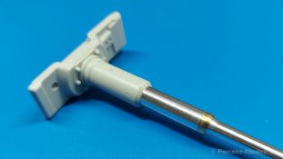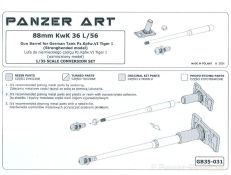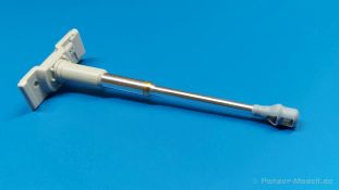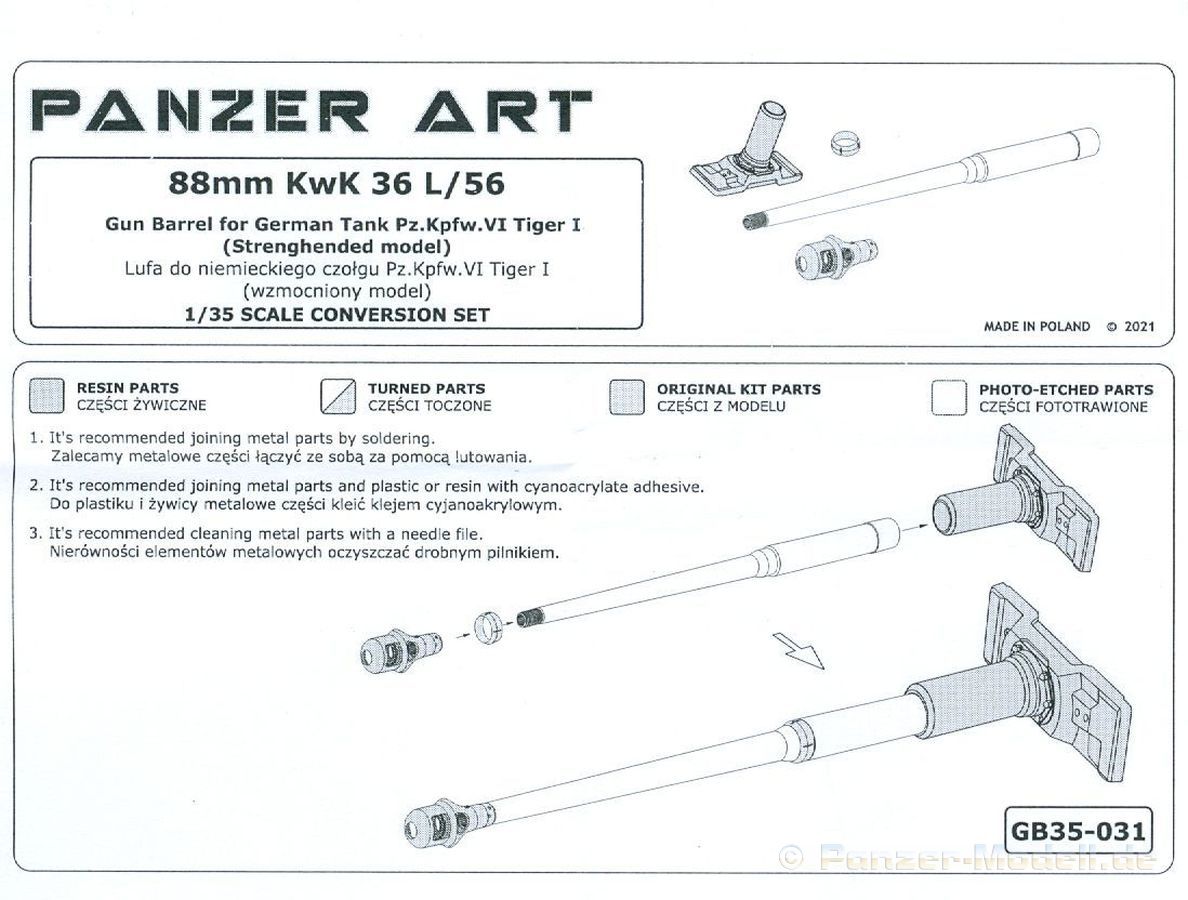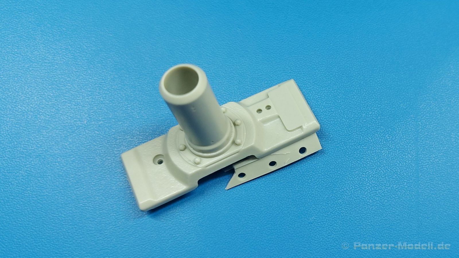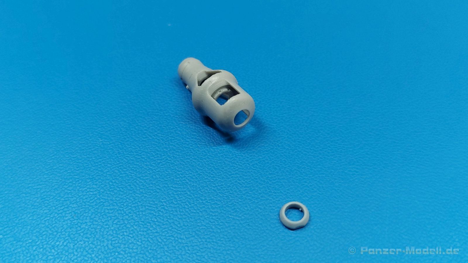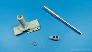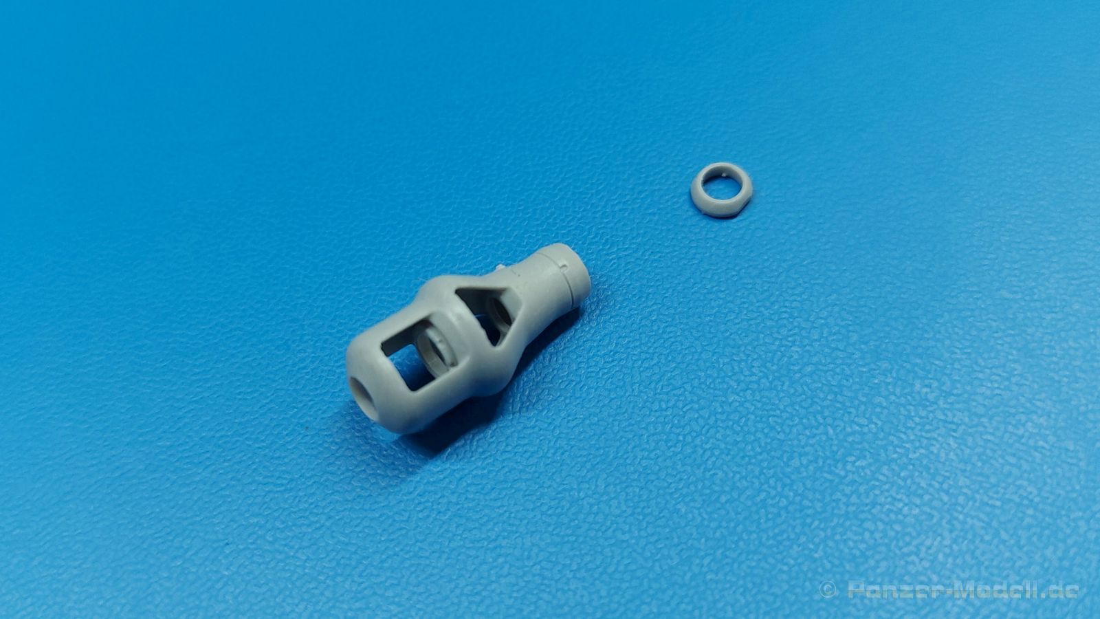 Auch wenn der Tiger I bereits ein starker Panzer war, gab es immer noch Raum zur Verbesserung basierend z.B. auf Fronterfahrungen der Besatzungen. So waren die Ausblicköffnungen der Optiken in der Blende eine Schwachstelle, die es zu beseitigen galt. So wurde um die beiden Öffnungen die Blende erheblich verdickt. Dies ist die Blende, die diesem Set neben dem Rohr aus Aluminium, einem Metallring und der Mündungsbremse beiliegt. Das Rohr ist im Original ein zweiteiliges Rohr, dessen Teile im unteren Drittel miteinander verschraubt waren. Das Alu-Rohr ist entsprechend aufgebaut. Die Mündung ist nur ein paar Millimeter weit geöffnet. Da die Mündungsbremse noch draufkommt, ist dies absolut ausreichend. Für die Verschraubung gibt es einen Messingring, der bis zum Absatz geschoben wird. Der Ring trägt die Einkerbungen, in die das Werkzeug zum Verschrauben eingegriffen hat. Die 3D-gedruckte Mündungsbremse ist nicht nur außen, sondern auch innen fein detailliert. Ich hoffe, dass man dies auf den Fotos gut genug erkennen kann. Ein paar winzige Stützstrukturreste sollte man noch entfernen. Wie auf den Fotos zu sehen, war bei meinem Muster noch ein kleiner 3D-gedruckter Ring, der theoretisch auf das Rohrende passen könnte, bevor man die Mündungsbremse befestigt, aber er ist weder auf dem Packungsbild noch in der kleinen Anleitung zu sehen. Zudem ist sein Innendurchmesser dann doch zu klein, um auf das Rohrende zu passen. Wahrscheinlich ist er versehentlich in die Packung gerutscht. Eine Öffnung für das koaxiale MG und zwei für die Zieloptik sind in der Blende. Wie beim Original ist die Verdickung um die Ausblicköffnungen vorhanden. Schöne Gussnummern und die Gussstruktur der Blende überzeugen mich. Das zylindrische Rohrlager ist glatt und am Ende angeschrägt. Die Verschraubungen sind einwandfrei sechseckig und scharf wiedergegeben. Alle Teile passen perfekt zusammen. Schmatzpassung kann man das nennen. Es wird nur wenig Klebstoff zu sichern benötigt. Ein kleines Zettelchen in schwarz-weiß dient aus Bauanleitung. Es sind allgemeine Hinweise zum Arbeiten mit Metall- und Resinteilen vorhanden. Es ist nicht angegeben, für welches Modell von welchem Hersteller dieses Set ist. Ein perfektes Set zum Upgraden von Tigern, die immer noch mit einem längsgeteilten Rohr daherkommen. In Deutschland bekommt man es um die 12 Euro.