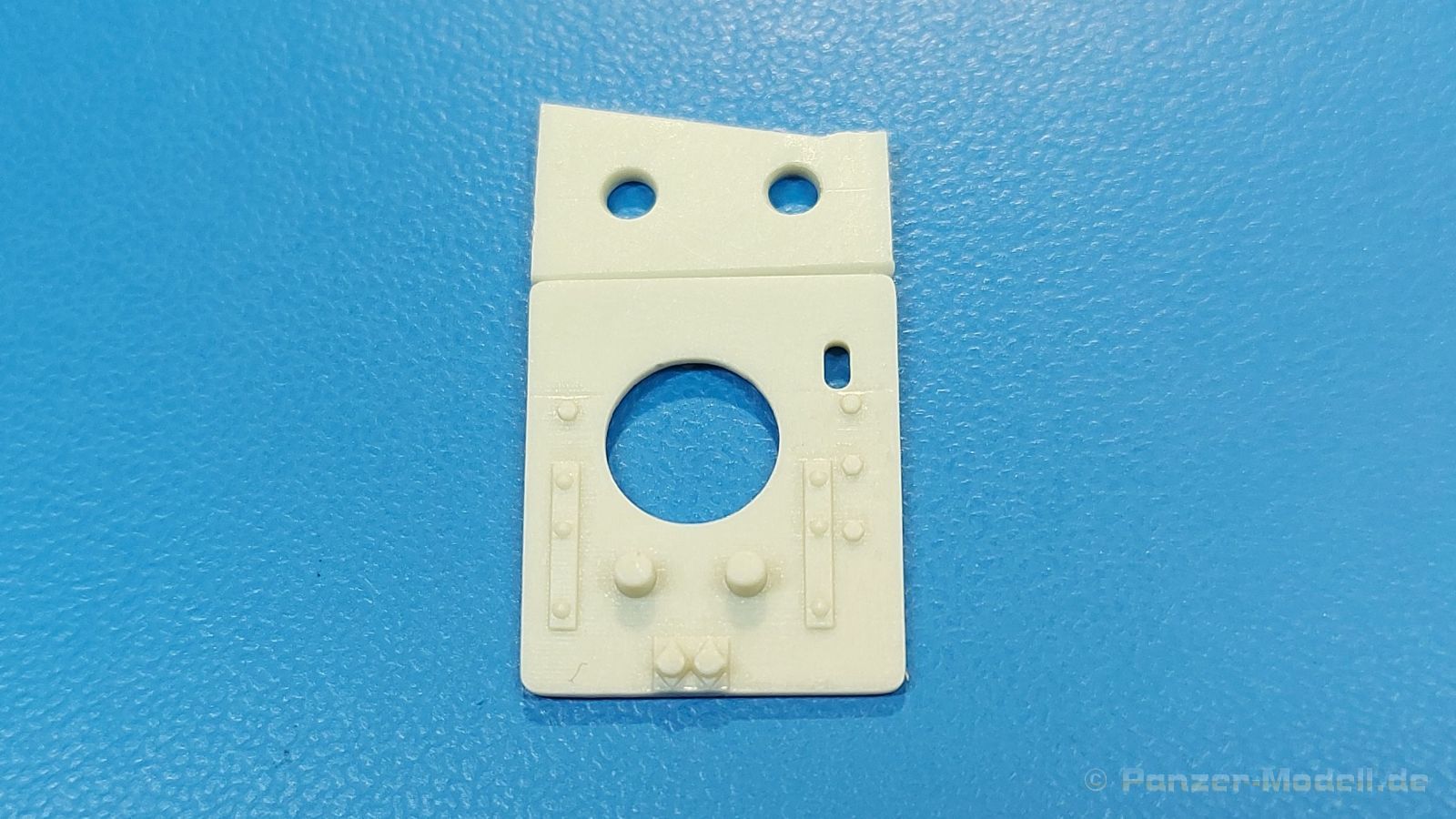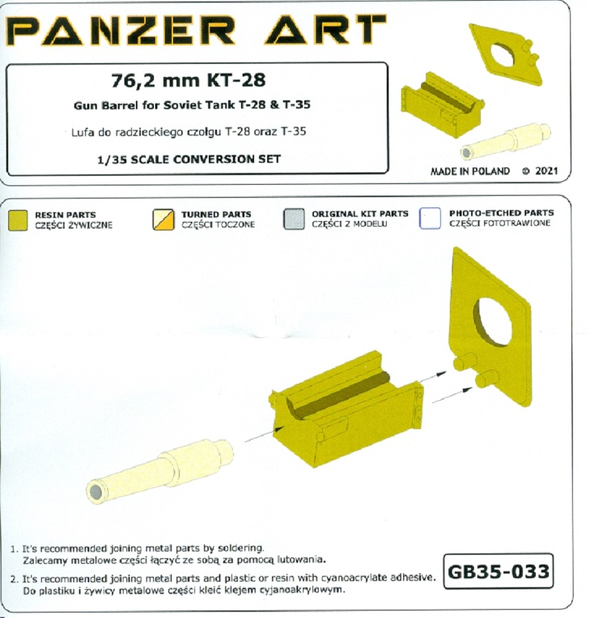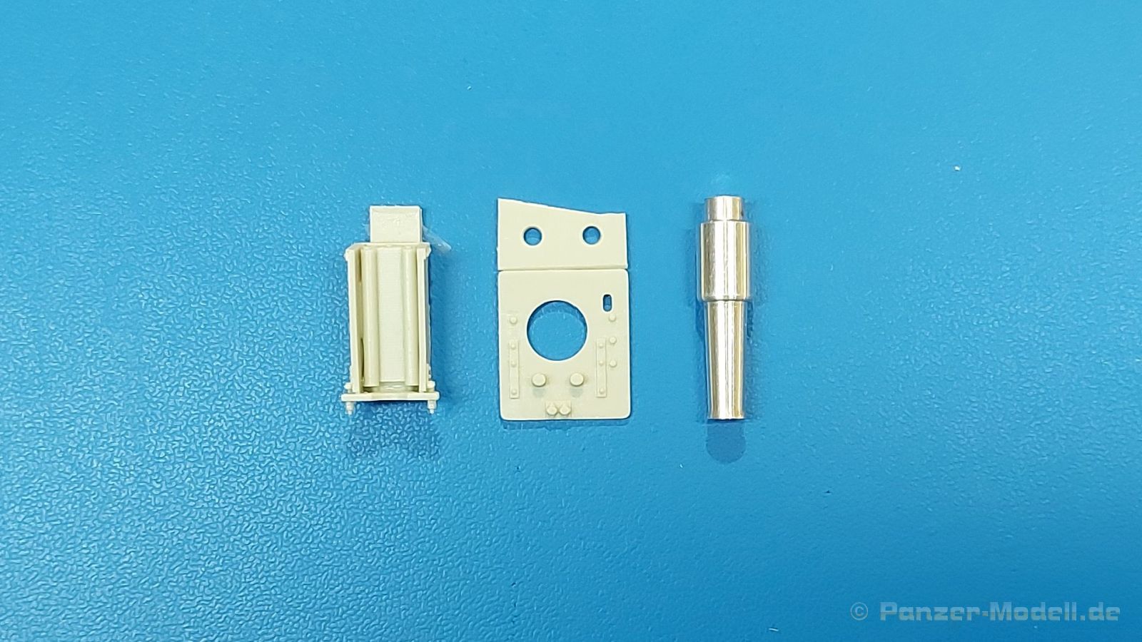 Für den Hauptturm eines T-35 oder T-28 bietet PanzerArt ein dreiteiliges Set bestehend aus Rohr (76 mm KT-28), Blendenkasten und Blendenpanzerung. Die Resinteile sind sauber gegossen, ohne Verzug, ohne Blasen. Der Anguss am Blendenkasten ist etwas groß und man sollte Geduld und eine ruhige Hand mitbringen beim Abtrennen. Das Gute ist, dass er an der Unterseite sitzt und die Trennstelle damit aus dem unmittelbaren Sichtbereich herausgehalten wird. Der Anguss der Blendenpanzerung ist sehr fein und besitzt eine Trennkante, die das Abtrennen erleichtert. Die Blendenpanzerung hat die Öffnung für das Rohr und die Zieloptik, zudem ist die Metallstruktur gut wiedergegeben. Vernietungen, Schraubenköpfe, Verstärkungsbleche und Befestigung der Rohrbremsen sind gestochen scharf ausgeführt. Der Blendenkasten ist innen hohl und zeigt die außenliegenden Zylinder der Rohrbremsen. Außen kommen gut die Vernietungen und die Verrieglungen der Kastenklappe zur Geltung. Das kurze Alu-Rohr in seiner typischen Form hat eine geöffnete Mündung. Züge und Felder konnte ich jetzt nicht erkennen, kann aber auch nicht sagen, ob das Original welche hatte oder nicht. Wie bei den meisten Alu-Rohren ist die Mündung nur ein paar Millimeter weit geöffnet, was allerdings nur auffällt, wenn man direkt von vorn hineinschaut. Blendenpanzerung und -kasten haben die entsprechenden Passstifte und Bohrungen, um perfekt zusammenzupassen. Das Rohr wird dann in das entsprechende Bauteil des Bausatzes eingesetzt. Da kein bestimmter Bausatz angesprochen wird, wird je nach Bausatz ggfs. etwas Anpassungsarbeit notwendig sein Ein kleines Zettelchen in schwarz-weiß dient aus Bauanleitung. Es sind allgemeine Hinweise zum Arbeiten mit Metall- und Resinteilen vorhanden. Allein die Resinteile stellen eine echte Aufwertung jedes T-35/T-28 Bausatzes dar. Das Rohr ist dann nur noch das i-Tüpfelchen. Der Preis um die 8,00 Euro in Deutschland ist meiner Meinung nach gerechtfertigt.