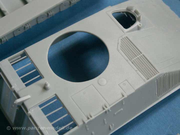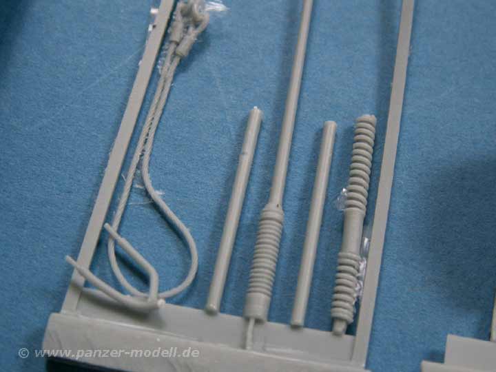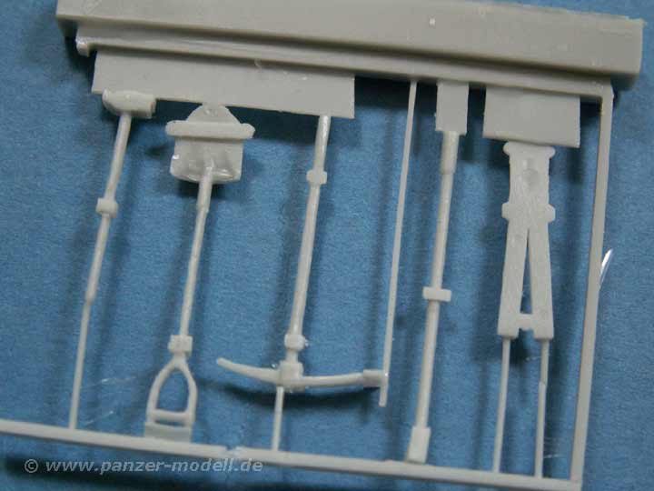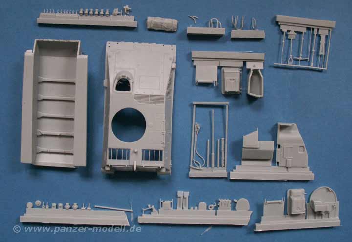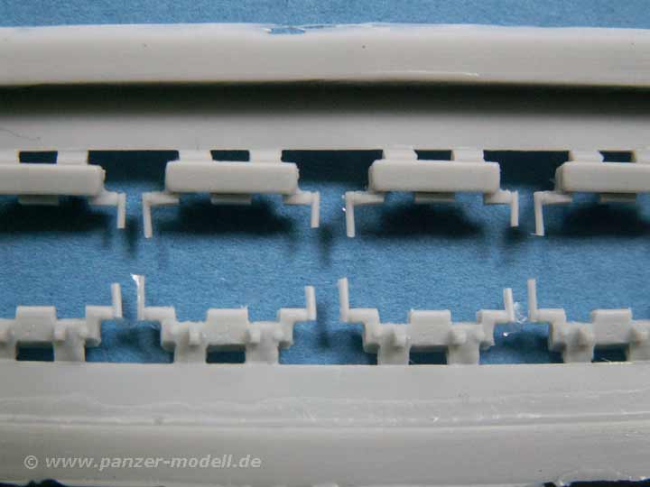 Auch gut und durchdacht ist die Teileausstattung, die keine Wünsche offenlässt, denn sogar eine rudimentäre Inneneinrichtung mit Motorwand, Sitzen, Drehstabfedern, usw. sind dabei und erlauben das offen-darstellen der Luken! Die Ketten sind filigran und sauber gegossen - es werden etwa 91 pro Seite benötigt, d.h. man hat letztlich etwa 18 Glieder als Reserve. Das Abtrennen vom Anguss dürfte nicht schwer sein (siehe Fotos).