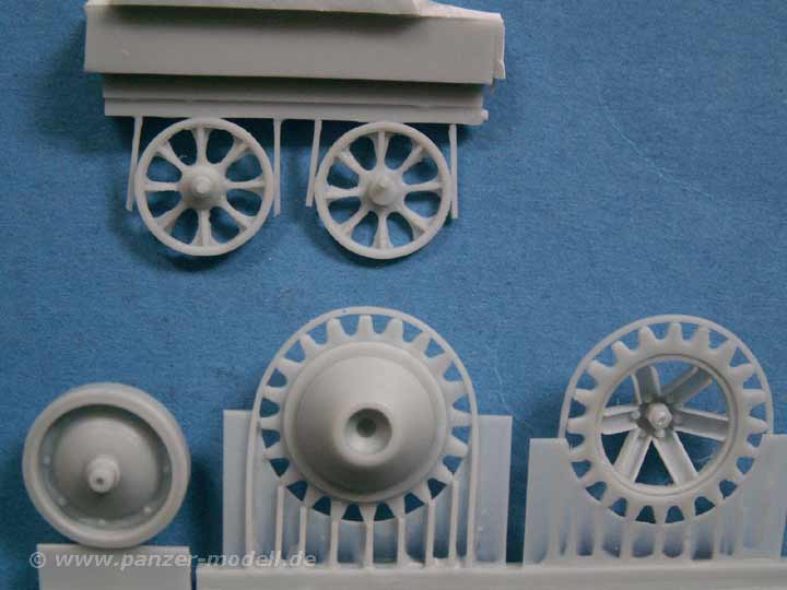 Die Teile sind samt und sonders von exzellenter Gussqualität ohne Bläschen oder Verwindungen und mit sehr feinen Details, dass so mancher Spritzgusshersteller blass werden würde. Besonders gut empfinde ich die durchdachte Anordnung der Angüsse, die so gering und an guten Stellen sind, dass sich die Nacharbeit in sehr kleinen grenzen hält - wer sonst Resinbausätze baut, wird das zu schätzen wissen. Manche Teile sind mit so winzigen Angüssen versehen, dass bereits bei ruppigem Transport das ein oder andere Teil vom Anguss fällt. Dank der Verpackung in Tütchen geht aber nichts verloren.