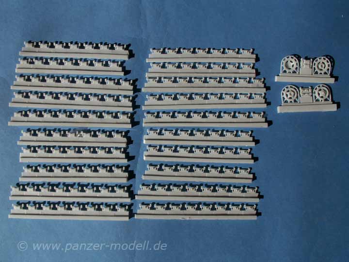Der Bausatz umfasst 150 Einzelkettenglieder aus Resin, zwei neue Treibräder und 2 Ersatzketten zu je zwei Gliedern.