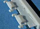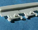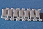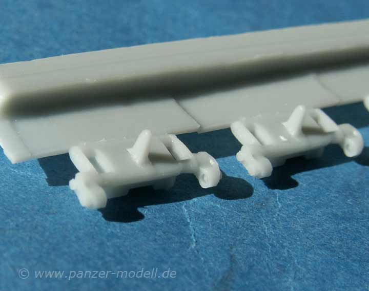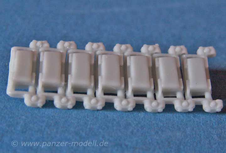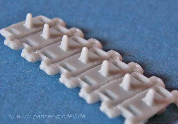 Die Resinteile sind durch und durch gut von der Qualität und Detailierung. Pro Glied sind bereits zwei Endverbinder angegossen. Dies ist auf der einen Seite natürlich extrem vereinfachend für den Zusammenbau, auf der anderen Seite beim Lauf um Treib- und Leitrad nicht ganz korrekt, da der Winkel ja zwischen beiden Gliedern und dem Endverbinder gleich sein muss. Aber das ist minimal und fällt nicht weiter ins Gewicht. Wichtiger ist hier die gute Verarbeitung und das modellbauerfreundliche Anbringen der Kettenglieder an einem Anguss - dieser ist nämlich sehr gut an der Längskante der Glieder angebracht und ist zudem so dünn, dass man die Glieder (mit etwas Vorsicht) einfach vom Anguss abknicken kann. D.h. die Arbeit hält sich stark in Grenzen.