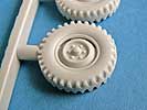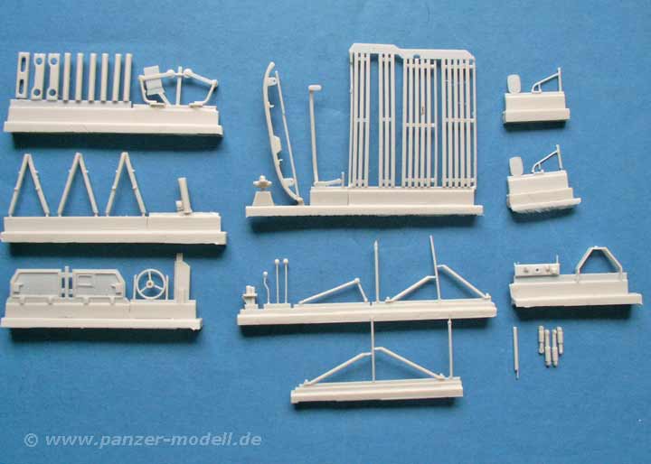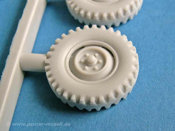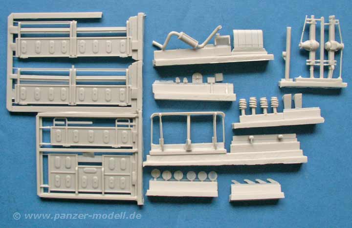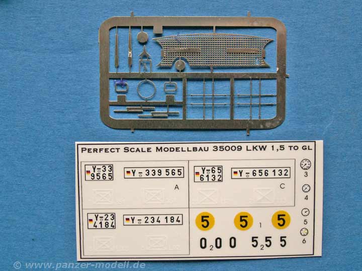 Der Bausatz umfasst 113 Bauteile aus Resin, die allesamt in hervorragender Qualität gegossen sind und weder Verzug noch Luftblasen aufweisen. Die Detailierung der Teile ist vorbildlich. Dazu enthält der Bausatz Klarplastik für die Windschutzscheibe, sowie klares Polystyrol für die Scheinwerfer. Besonders lobenswert ist die Beigabe von PE Teilen für den Kühlergrill, Mercedesstern, Lampenschutzbügeln und weiteren Kleinstteilen sowie einem Decalbogen mit Nummernschildern für 3 verschiedene Fahrzeuge und dementsprechende taktische Zeichen (1./PzGren.351, 5./PzGrenLehr.92 und 2./Jg.113) in weiss, 3 MLC Schilder in gelb und rund, sowie als einzelne Ziffern für die Einzelscheiben der MLC Schilder UND, besonders erwähnenswert, 4 Decals für Rundinstrumente des Armaturenbretts. So eine Auswahl hat man bislang bei Resinmodellen noch nicht gesehen!.