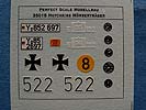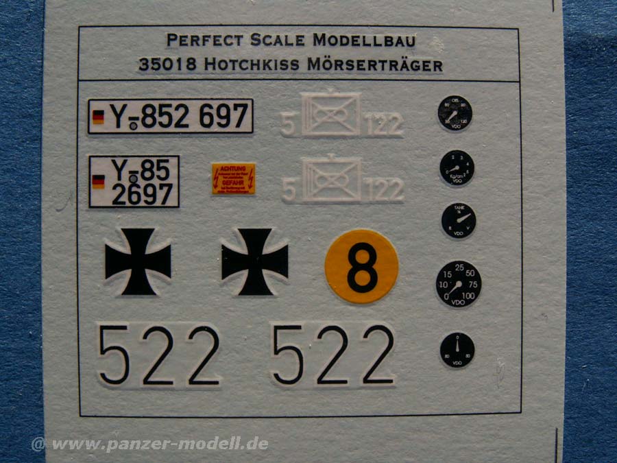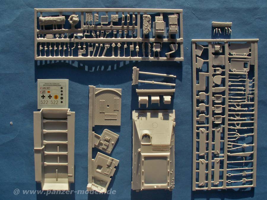 Besonders positiv fällt wieder die Beilage eines Decalsheets auf - Auf dem Decalsheet finden sich die entsprechend passenden markierungen, je ein Nummernschild für vorn und hinten, zwei Eiserne Kreuze, ein MLC Schild, ein Satz Nummern "522", ein Warnschild, Anzeigen für die Fahrerinstrumententafel und natürlich die taktischen Zeichen - in diesem Fall 5./PzGrenBtl.122. Ein paar mehr hätten es zwar sein dürfen aber man darf ja wirklich froh sein, dass in einem Resinbausatz überhaupt Decals sind.