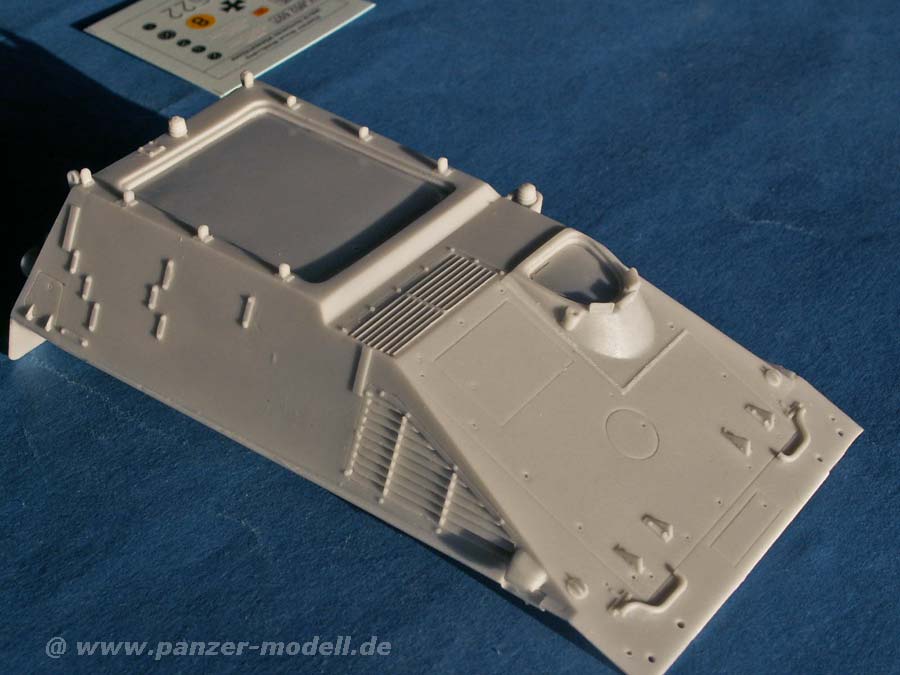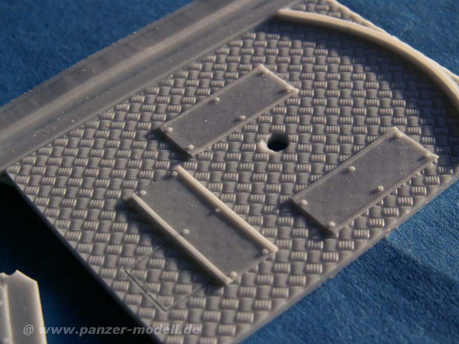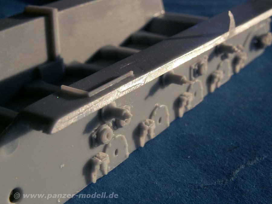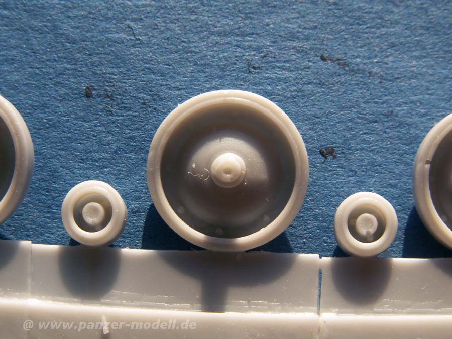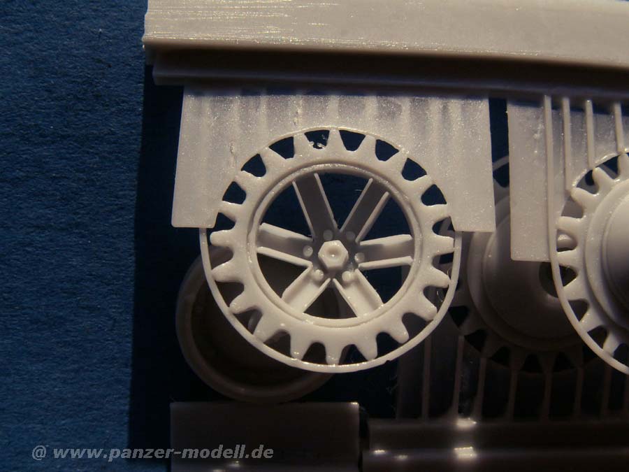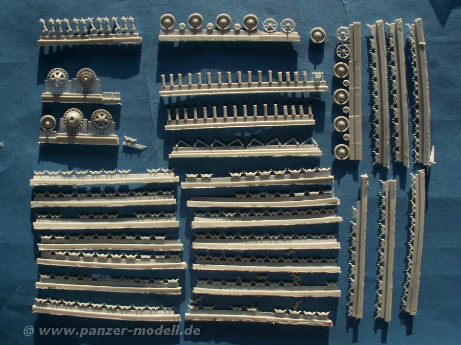 Die Kette ist als Einzelgliedkette im Bausatz für die 200 Glieder bereitliegen - diese lassen sich recht einfach vom Anguss trennen und versäubern - teilweise fallen sie bereit beim Transpot vom Anguss an. Als Einzelgliedkette natürlich für den Zusammenbau etwas aufwändiger, für die Detailierung aber das Beste was man sich wünschen kann. Die Wanne ist in Ober- und Unterwanne getrennt und beide Teile sind absolut luftblasen- und verzugsfrei. Die Oberwanne ist mit allen Luken zum Kampraum offen darstellbar. Die Schwingarme sind einzeln einsteckbar, also auch variabel anpassbar, falls man das Modell in ein Diorama einarbeiten will.
