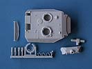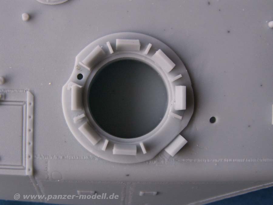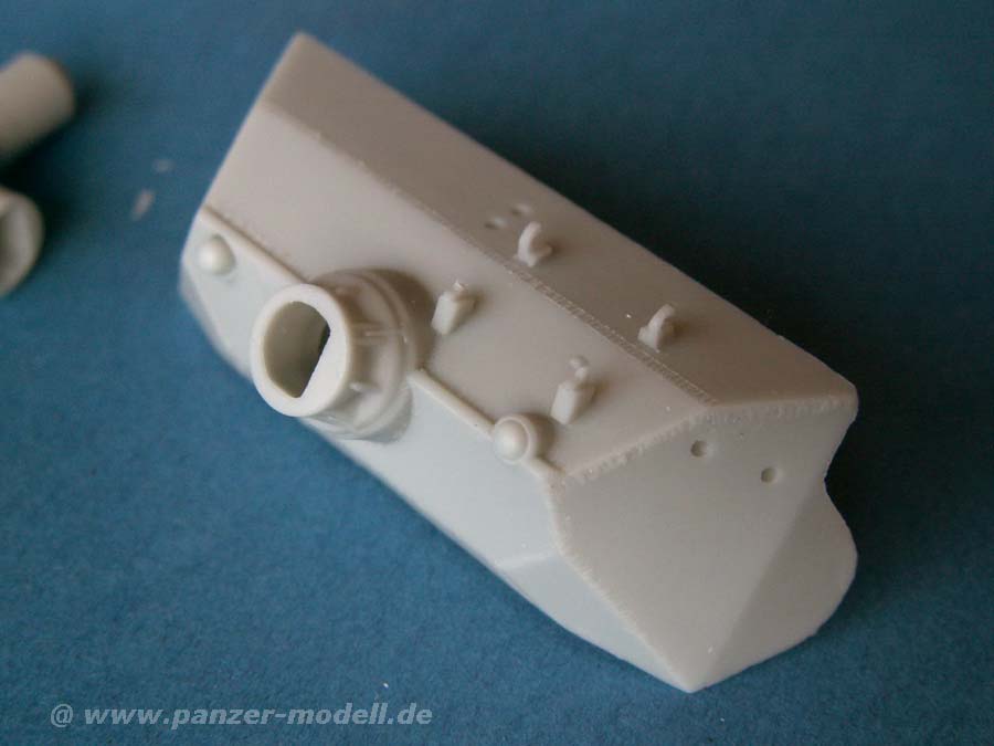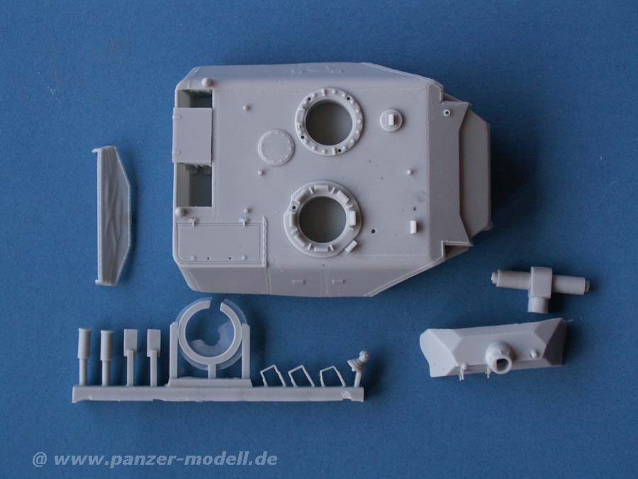 Enthalten ist der Turm an sich als recht komplettes und massives Teil. Große Pluspunkte sind hier die Anbringung der markanten A3 Turmmerkmale und die Korrektur der Winkelspiegelanordnung an der Kommandantenluke, die ja bei den Plastikmodellen falsch ist. Anls Anbauteile sind die Kanoennblende mit Plane, Winkelspiegelabdeckungen, das TRP, Entfernungsmesser und der neue Drehring für die Kommandantenkuppel.