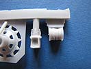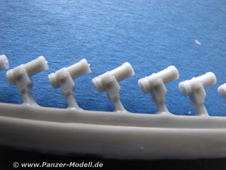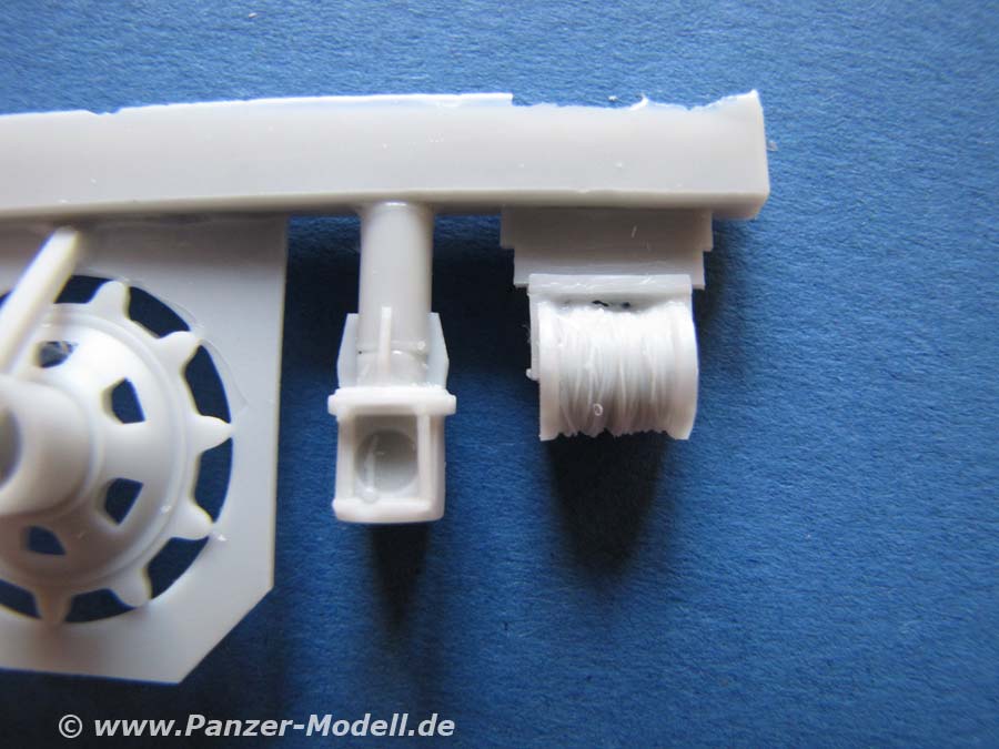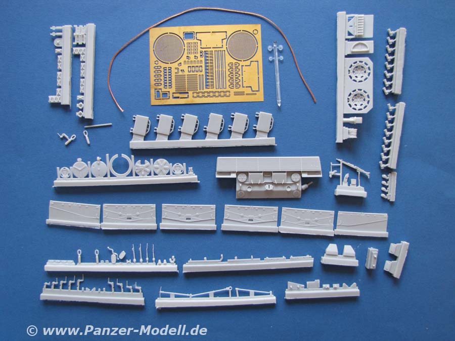 Die resinteile sind durch die Bank wieder von hervorragender Qualität. Die Detailierung ist sehr gut, Luftblasen oder Verzug sind nicht festzustellen, was gerade bei den relativ dünnen Seitenschürzen sehr poitiv auffällt