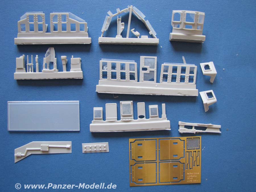 Das Set enthält die beiden dicken Zusatzpanzerplatten recht und links für die Wannenseiten, plus 92 Zusatzpanzerschilde ARAT II Panzerung, die wie Dachpfannen aussehen. Dazu eine neue Bodenpanzerplatte, die neue Zusatzlafette des .50er MG mit entsprechendem MG aus Resin und Kabelkanal. Dazu Lafette für das .30er MG mit WBG und natürlich die auffälligen verglasten Schutzschilde auf dem Turmdach.