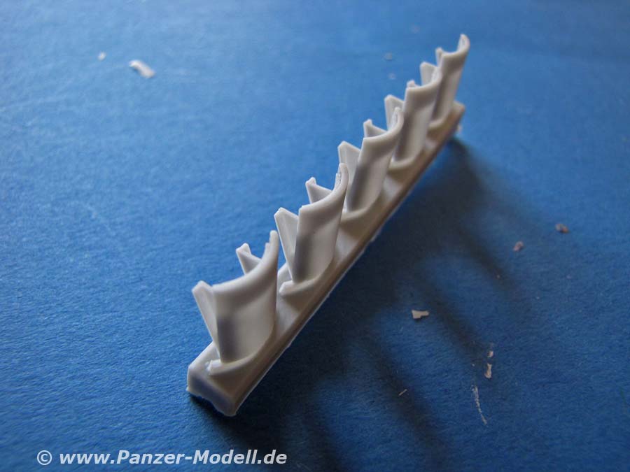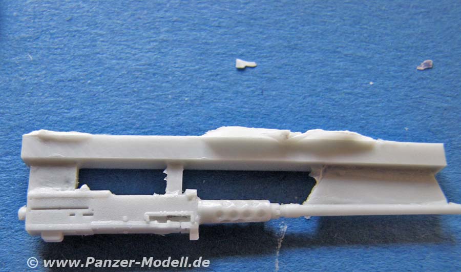 Die Detailierung der Teile ist sehr gut - an den Schutzschilden muss etwa Fischhaut von Guss entfernt werden, aber sollte kein Problem darstellen. Das Browning mG macht einen guten Eindruck, auch wenn es aus Metall natürlich noch feiner ist. Die ARAT II Panzerplatten sind maßstäblich angenehm dünn und dabei gut ausgeformt ohne Luftbläschen oder Macken.