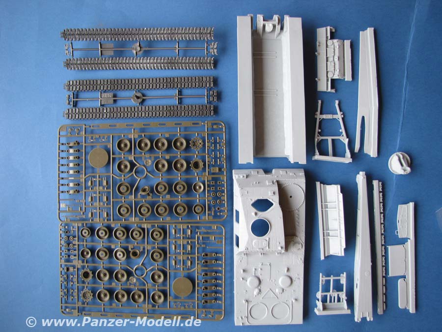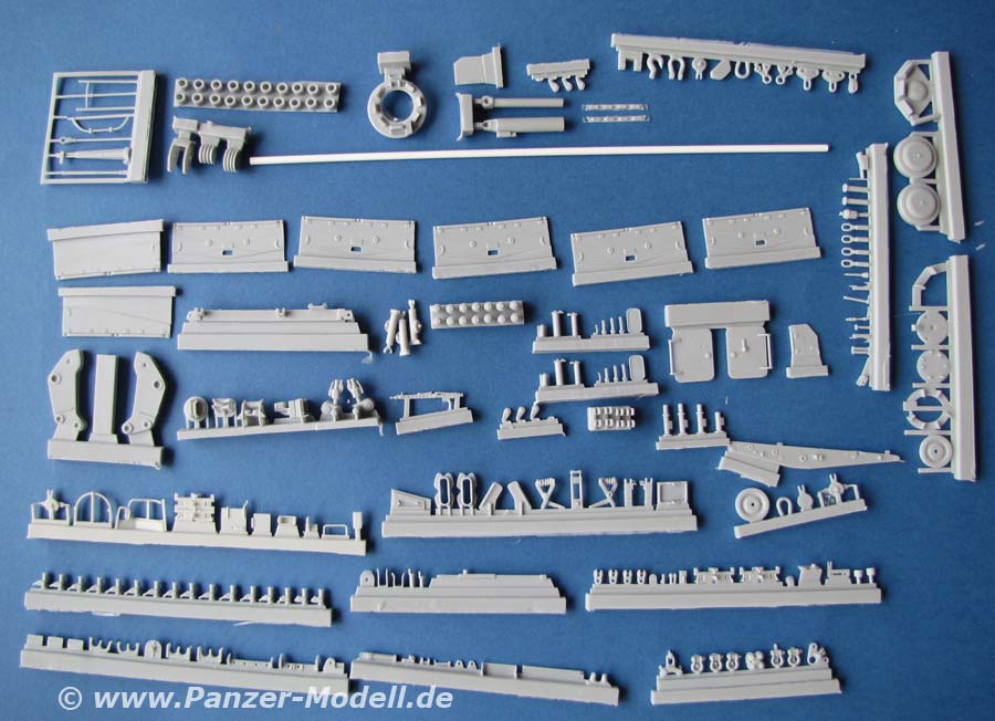 Der Bausatz umfasst 254 Bauteile aus Resin, PE Teile, Vinylketten von Revell, ein schönes weiches Kupferkabel, Tamiya Spritzgussteile und wieder einen kompletten Decalbogen.