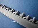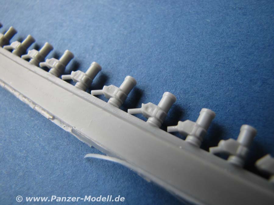 Schade, dass man sich zur störrischen Vinylkette von Revell entschlossen hat, die aus je zwei Halbteilen zusammensetzt. Nach meinem Empfinden ist die Tamiya Kette weicher und detaillierter und wäre besser geeignet n(wennauch sicher wesentlich teurer). Auf jeden Fall erleichtert die Vinylkette das Aufziehen, statt einer Resin Einzelgliedkette.