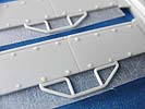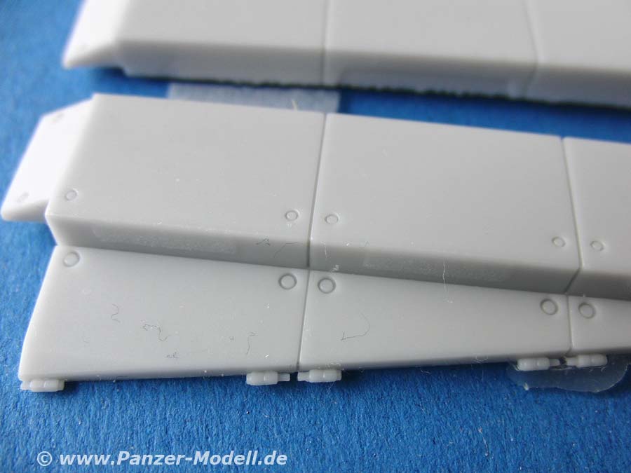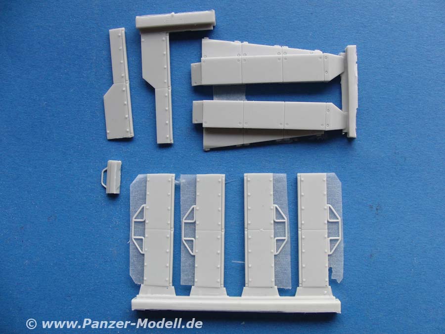 Die Teile umfassen sowohl die vorderen als auch wie gesagt die hinteren Kettenblenden, wobei die hinteren in Zweierelementen in einem Stück und mit Aufstiegshilfe gegossen sind. Letztere sind in eine feine Fischhaut gegossen, die aber recht einfaxh zu entfernen sein dürfte. Einziges Kleines Manko ... nach meinem Empfinden sind die Schraubenköpfe eine winzige Spur zu groß geraten ... aber wer will sowas schon selber machen??