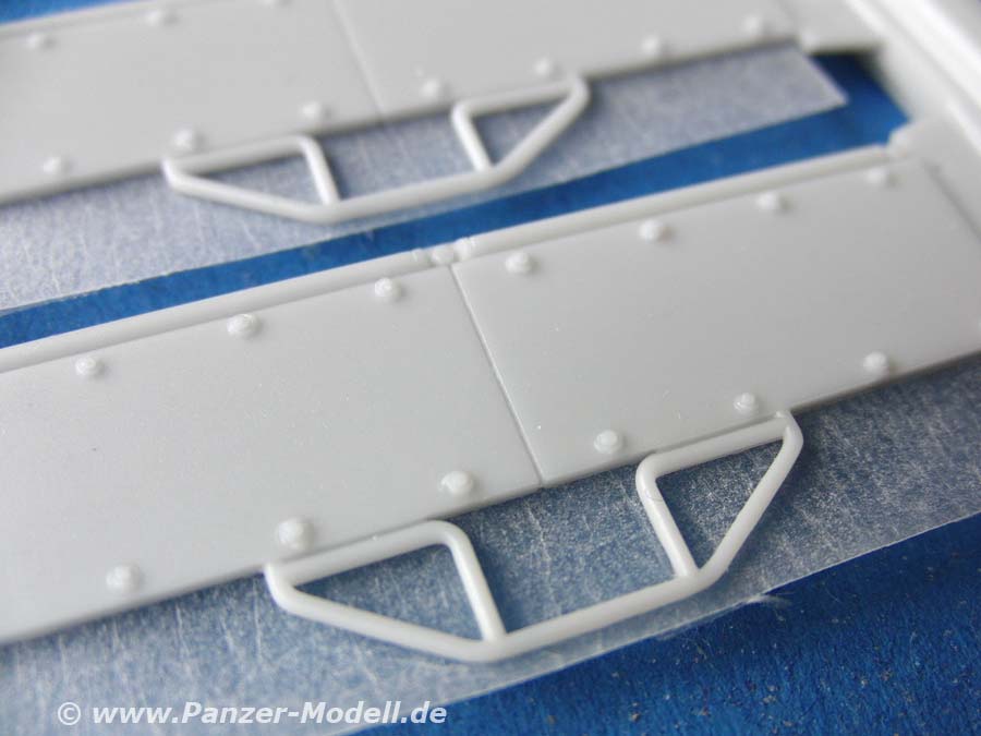 Wer jetzt denkt, dass diese "neuen" Kettenschürzen doch auch schon bei den meisten Bausätzen beiliegen, der irrt gewaltig. Denn was viele nicht wissen, dass bei den neuen schweren Kettenblenden eine neue Version Einzug gehalten hat. Während die bisherigen Kettenblenden versenkte Schraubenköpfe aufweisen, zeigt dieses Set die neu eingeführten Blenden mit den aufgesetzten Schraubenköpfen.