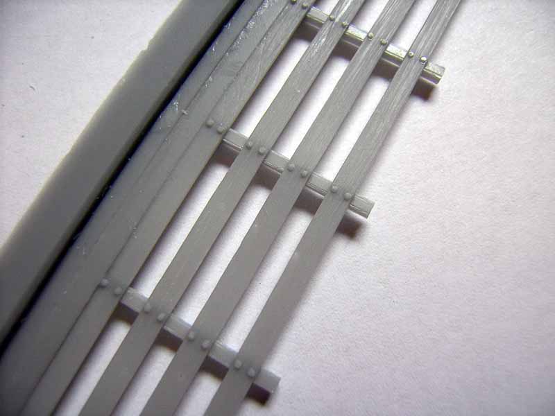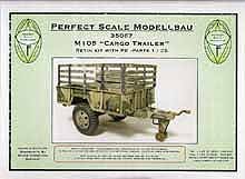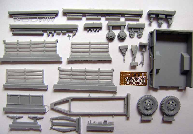 Der Anhänger bietet, bedingt durch die lange Einsatzdauer, eine Vielfalt bei der späteren Bemalung. So lassen sich die Anhänger in Olive Drab für den Einsatz ab dem Vietnamkrieg, aber auch in den später folgenden Tarnanstrichen wie der MASSTER Tarnung, dem MERDC-Tarnanstrich oder dem Versuchsanstrich Dual-Tex darstellen. Da dieser Anhänger auch heute noch im Einsatz ist kann eine Bemalung im aktuellen CARC NATO Dreifarb-Fleckentarnanstrich oder in Sandgelb ebenfalls erfolgen. Der Bausatz enthält 63 Bauteile aus hellgrauem Resin, sowie einer kleinen PE-Platine mit 32 Bauteilen. Decals für die Markierung des Anhängers liegen nicht bei. Die Resinbauteile sind, wie immer bei diesem Hersteller, sehr sauber und detailliert gegossen. Die Fertigungsqualität der Bausätze liegt bei Perfect Scale auf sehr hohem Niveau. Nicht jedoch die Qualität und Sorgfalt bei der Verpackung der Bausätze. Sämtliche Resinbauteile wurden gemeinsam in einer Tüte verpackt. Die extrem filigranen Schutzbügel und Haltegriffe sind nun wahrhaftig sehr dünn und fein gegossen. Und wenn man solche feinen Teile separat in einer Tüte verpacken würde dürfte sich die Bruchgefahr für die Kleinteile erheblich minimieren. Bei meinem Bausatz sind die meisten der Schutzbügel vom Gussrahmen abgebrochen, zum Teil sogar zerbrochen. Siehe Detailfoto. Die Ladefläche des Anhängers ist aus einem Stück gegossen und weist schöne scharfkantige Details auf. Verzug ist nicht feststellbar, Luftblasen im Guss sind ebenfalls nicht vorhanden. Die, optional verwendbaren, feinen Bordwanderhöhungen, die `Stack Racks´, sind dagegen leicht verzogen. Das liegt an der sehr geringen Materialstärke, dürfte sich aber aufgrund der Flexibilität des Materials sehr leicht wieder richten lassen. Die eingeprägte Holzstruktur der Bretter ist hervorragend wiedergegeben. Und es gibt noch viele weitere schöne Details, wie z. B. sehr gut gefertigte Kompletträder mit einwandfrei gegossenem Profil, saubere 'Good Year'-Schriftzüge an den Reifenflanken und fein detaillierte Federpakete für die Darstellung der Blattfederung. Die Photoätzteile finden ihre Verwendung als Beschläge und Sicherungsketten und werten das Modell zusätzlich auf. Die Bauanleitung im DIN-A4 Format besteht aus vier Seiten und beschreibt zunächst Grundsätze für den Resinmodellbau mit allgemeinen Hinweisen, gefolgt von einer Stückliste mit Übersicht der Bauteile. Der Bau wird anhand von acht Fotos dokumentiert. Die einzelnen Bauteile sind jeweils außerhalb des Fotos zusätzlich aufgezeichnet, Pfeile weisen dann auf die Montagestellen hin. Kurze Text-Hinweise zum Einbau der Teile und zur Farbgebung runden die Anleitung ab. Jedoch wurde der Anhänger aus grauem Resin vor einem grauen Hintergrund fotografiert. Die kontrastarmen Bilder lassen die exakte Zuordnung und Position der Bauteile zueinander zum Teil nur schwer erkennen. Die hintere Stütze der Ladefläche wird optional abgesenkt (für den abgestellten Anhänger) und hochgeklappt (für den Fahrbetrieb) beschrieben. Das Stützrad an der Deichsel dagegen nicht. Wer den Anhänger mit einem Zugfahrzeug darstellen will muss sich daher Referenzen beschaffen um das Stützrad vorbildgerecht, für den Fahrbetrieb hochgeklappt, zu montieren. Leider befinden sich im Bausatz keine Teile für die Darstellung der Druckluftbremsleitungen und Stromkabel, die Anschlüsse für die Steuer- und Vorratsleitung der Bremse müssen, wie auch der Stecker für das Stromkabel, ebenfalls im Eigenbau gefertigt werden. |