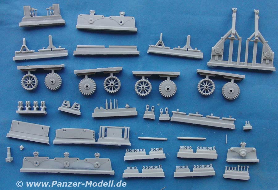 Der Bausatz besteht aus insgesamt 110 Resinteilen die sich zu einem Minenroller zusammenbauen lassen, der wahlweise an Leopard 1 und Leopard 2 anbaubar ist.