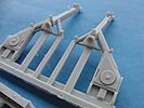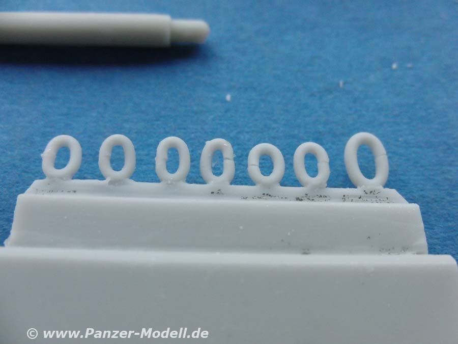Interessanterweise sind die schweren Gliederketten, die jeden Rollenwagen am Halterahmen sichern aus einzelnen Ösen aus Resin bestehen und durch einschneiden ineinander verbaut werden. Ist eine etwas aufwändige Arbeit - ggf. wäre eine Metallgliederkette hier schneller und sinnvoller. Eine solche soll dann noch vorn zwischen beiden Rollenwagen gespannt werden, liegt aber nicht dem bausatz bei.