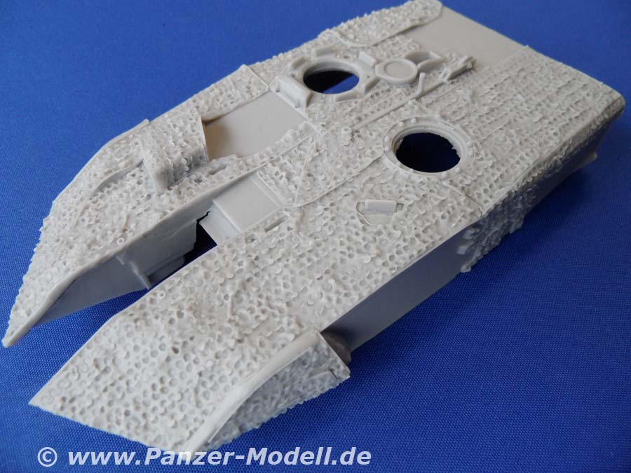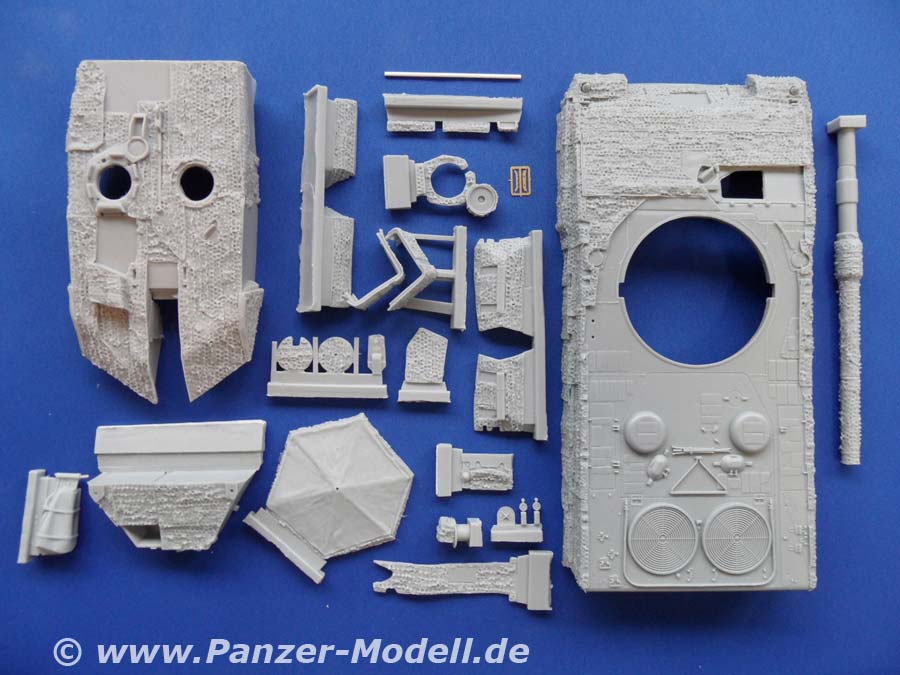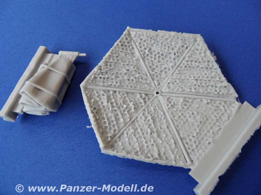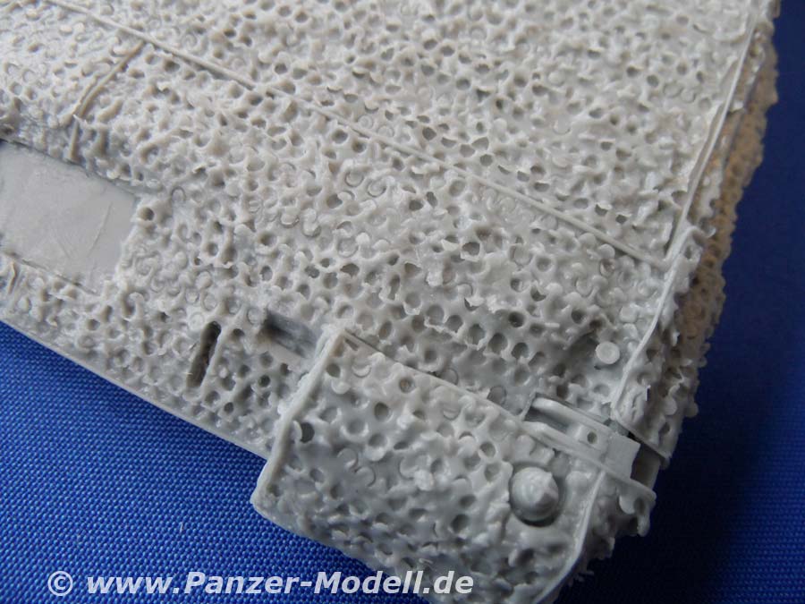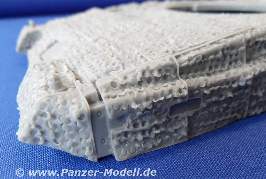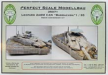 Nachdem Perfect Scale (folgend PS) den Umbausatz für den Leo ohne Barracuda-Tarnmatten herausgebracht hat folgte bald auch die Version mit den Tarnmatten. Dies gibt es inzwischen von drei Herstellern: Cromwell, Black Dog und eben PS. Den Cromwellsatz konnte ich mit Herrn Betzler, dem Inhaber von PS, in Munster beim Pfingstreffen im Panzermuseum (sei an dieser Stelle allen wärmsten empfohlen!), unter die Lupe nehmen. Man will ja eigentlich nichts schlecht sagen, aber wenn etwas schlecht ist, dann läßt sich einfach nix schön reden! Die taugt nix! Bleiben noch BlackDog und PS. Beide sind von der Verarbeitung sehr schön, aber BlackDog hat die „Löcher“ in den Tarnmatten viel zu groß gemacht. Bleibt also als logische Konsequenz nur Perfekt Scale! Und hier hat sich der gute Hr. Betzler selbst übertroffen! Ich will nicht wissen (doch, eigentlich schon, aber er sagt ja nix) wie er das gemacht hat! Das Urmodell muß ein völliger Krampf gewesen sein! So viele „Löcher“ so genau zu plazieren! Mein Respekt an dieser Stelle! Aber jetzt endlich zum Bausatz! Der Umbausatz basiert auf dem Leo 2A6M CAN von Hobbyboss, von dem allerdings nicht viel mehr übrig bleibt als die Unterwanne und die Slat Armour. Oberwanne und Turmoberteil liegen als perfekt gegossene und völlig verzugfreie Resinteile neben diversen Klein- und Anbauteilen in einem handlichen Karton. Zudem noch zwei Ätzteile fürs PERI und ein Stück Plastikprofil für den Sonnenschirm. Und wenn wir gleich da sind: Der Sonnenschirm liegt sowohl ausgefaltet als auch zusammengefaltet bei. Die weiteren Resinteile beinhalten die Schlagschattentarnung, verbarracudate Staukörbe und Kanonenrohr (natürlich ohne jeden Verzug) und diverse Anbauteile und die Staukiste für die Sturmgewehre vor der Kommandantenluke. Der Zusammenbau dürfte sich aufgrund der zu erwartenden Passgenauigkeit und Qualität der gebotenen Teile einfach gestalten. Nur absolute Resinneulinge sollten lieber die Finger davon lassen. Die Bauanleitung ist typisch PS. Ein doppelseitig bedrucktes DIN A4 Blatt mit s/w Fotos der einzelnen Baustufen und drei Farbfotos eines gebauten Modells. Fazit: Aufgrund der Mängel der Mittbewerber die einzig logische Wahl, will man einen Can-Leo mit Barracuda bauen. Allerdings auch mit ca. 85-90 EUR auch kein Umbausatz für „mal-eben-vom-Taschengeld“. Und wie immer: Wenn ich schon so einen Umbausatz baue, dann bitte auch mit dem Minenroller! Und dann brauch man ja auch noch eine Besatzung! Und evtl. die Slat von Eduard aus Ätzteilen? Egal wie, dass ist ein größeres Vorhaben! Aber man wird mit einem der interessantesten Panzer der Neuzeit belohnt! Nur schade, dass das Original inzwischen nicht mehr im Dienst ist.
