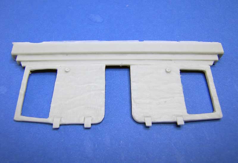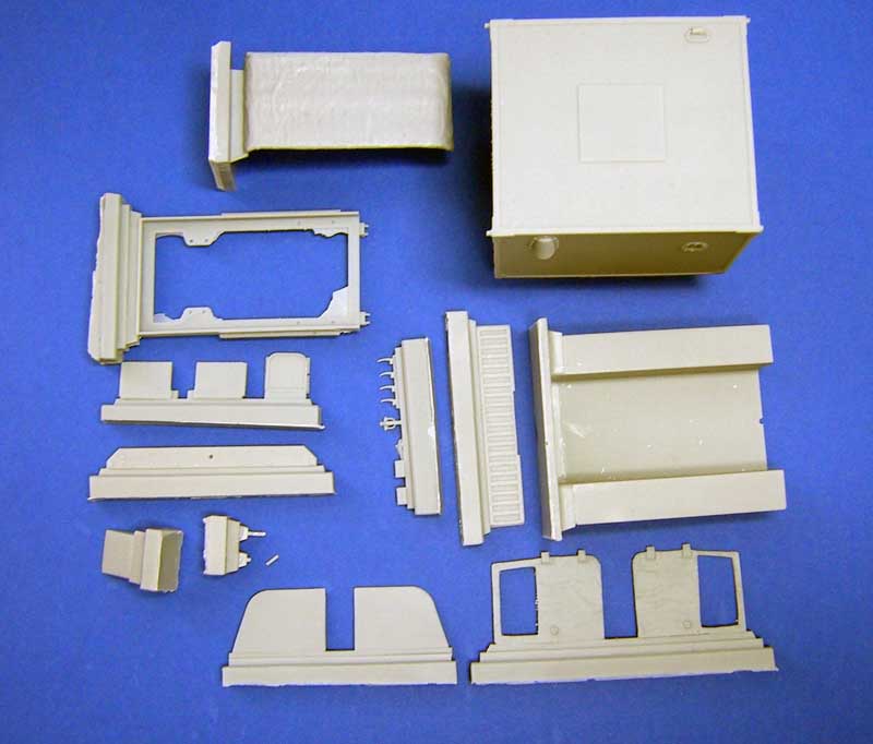 Und nun zum Bausatzinhalt: Die Qualität der Bauteile ist ebenfalls sehr gut. Scharfkantig und mit feinen, voll ausgegossenen Details stellen die Bauteile eine echte Augenweide dar. Enthalten ist ein kompletter einteiliger Shelter, neue Türen, ein neues Verdeck für das Dach und weitere Anbauteile.