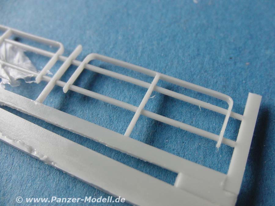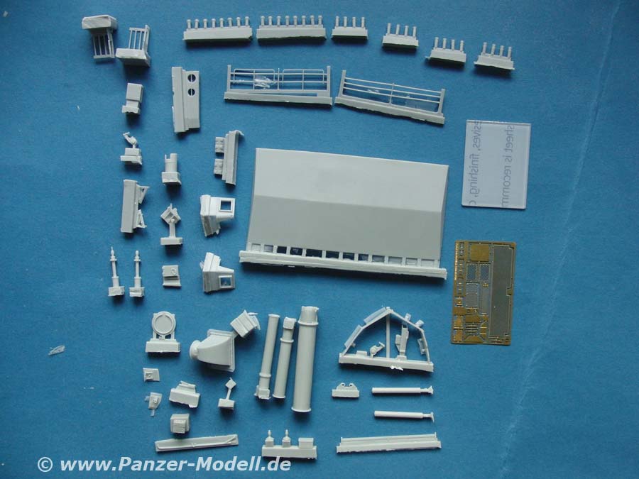 Der Guss der Teile ist sauber und fein detailliert. Die Staukörbe sind in ihrer Filigranität beachtlich - hier findet man etwas Fischhaut, die aber schnell entgernt ist. Der rest der Teile ist auch sehr gut gegossen und ohne jegliche Gießfehler. Zur weiteren Detaillierung liegen PE Teile bei, die sauber geätzt sind und so feine Teile wie Gittermaterial, Halterungen, Bleche, usw. beinhalten.