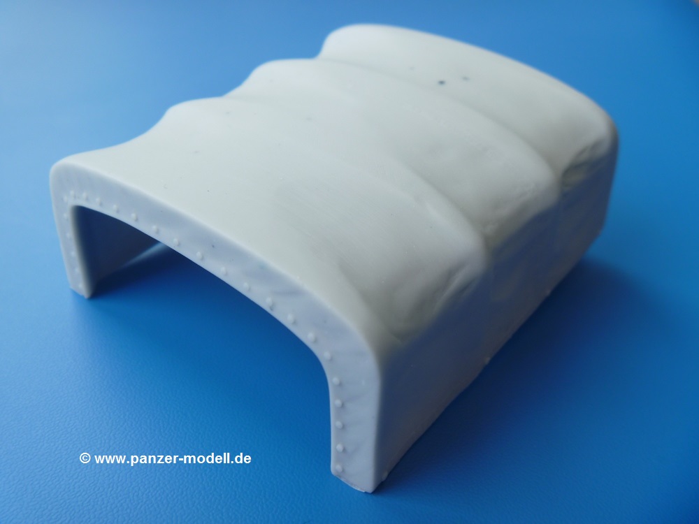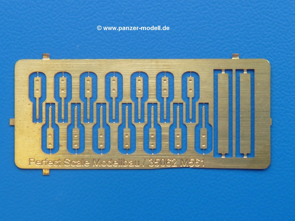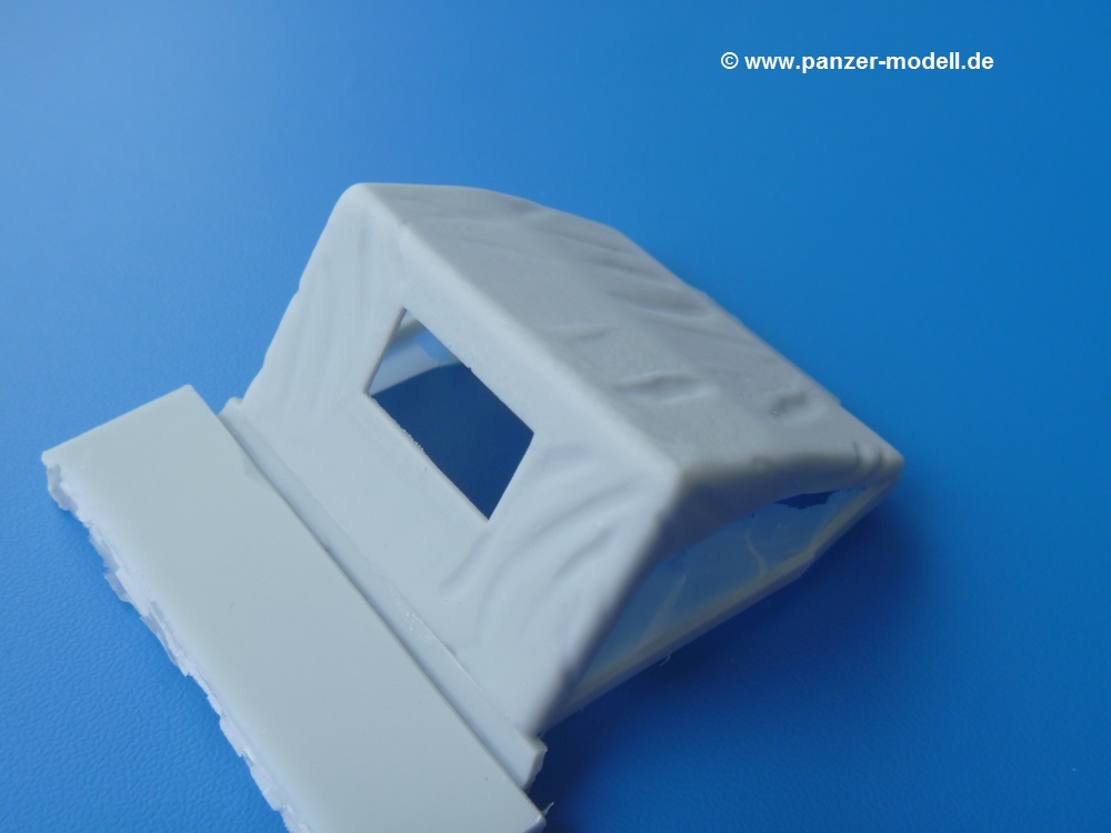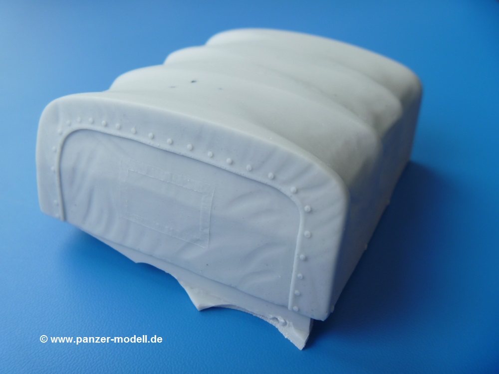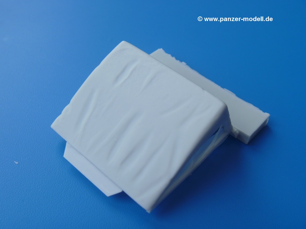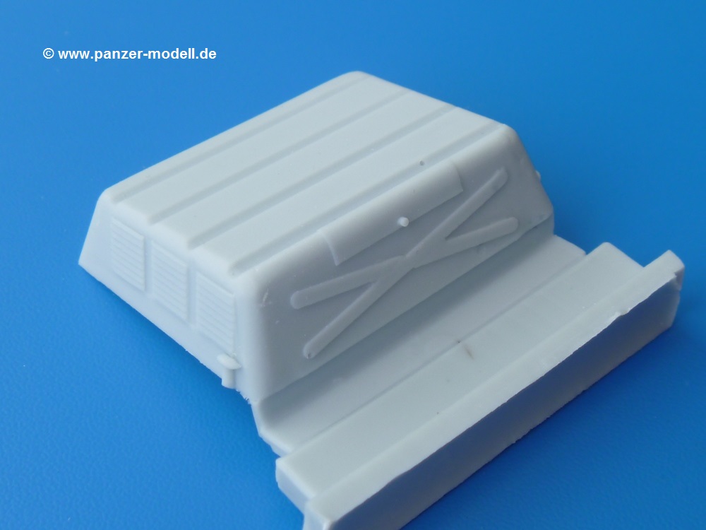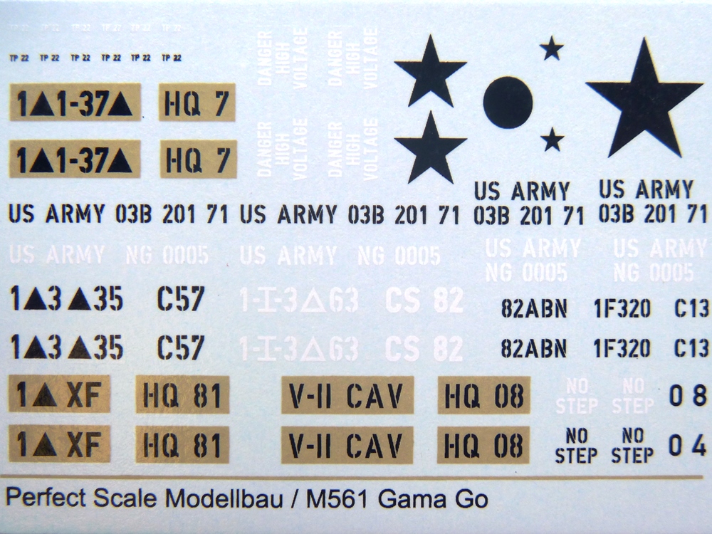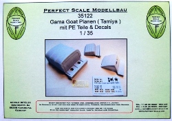 Die Resinteile sind frei von Verzug und Blasen. Die Dachplane für den Fahrerraum ist recht dünn mit schönem, glaubhaften Faltenwurf. Man muss nur die Stabilisierungsträger entfernen und kann die Plane gleich aufsetzen. Die Plane für den Anhänger ist wesentlich stabiler ausgeführt. Sie ist an der Frontseite verschlossen mit einem ebenfalls verschlossenen Fenster, dessen Nähte sehr fein herausgearbeitet sind. An der Rückseite ist die Plane offen und erlaubt den Blick auf die Ladefläche. Während Tamiya seinem Gama Goat eine eckige Motorabdeckung beschert, liefert uns Perfect Scale die Version mit abgerundeten Kanten und Verstärkungsrillen auf dem Dach. Für das einzige Fenster in der Rückseite der Fahrerraumplane liegt eine glasklare Folie bei, aus der man sich mit der Schere das benötigte Teil herausschneidet. Achtung: Die Anleitung geht auf die Folie nicht ein, aber man sieht sofort, wofür sie gedacht ist. Die Ätzteilplatine liefert 14 Spannhaken für den Anhänger - je 5 an den Seiten und je 2 für Vorder- und Rückseite. Der Decalbogen enthält verschiedene Fahrzeugmarkierungen in schwarz, weiß oder scharz auf sandgelben Untergrund. Dazu kommen Beschriftungen wie "Danger High Voltage", "No Step" und "TP 22". Es wird leider nicht angegeben, für welche Einheiten diese Abzeichen gelten oder wo sie angebracht werden. Hier wird man wohl die Tamiya Bauanleitung, bzw. Originalquellen zu Rate ziehen müssen. Dieses wunderschöne Set gibt dem Gama Goat einen tollen, neuen Look. Zur Zeit im deutschen Handel für um die EUR21,50 erhältlich. |