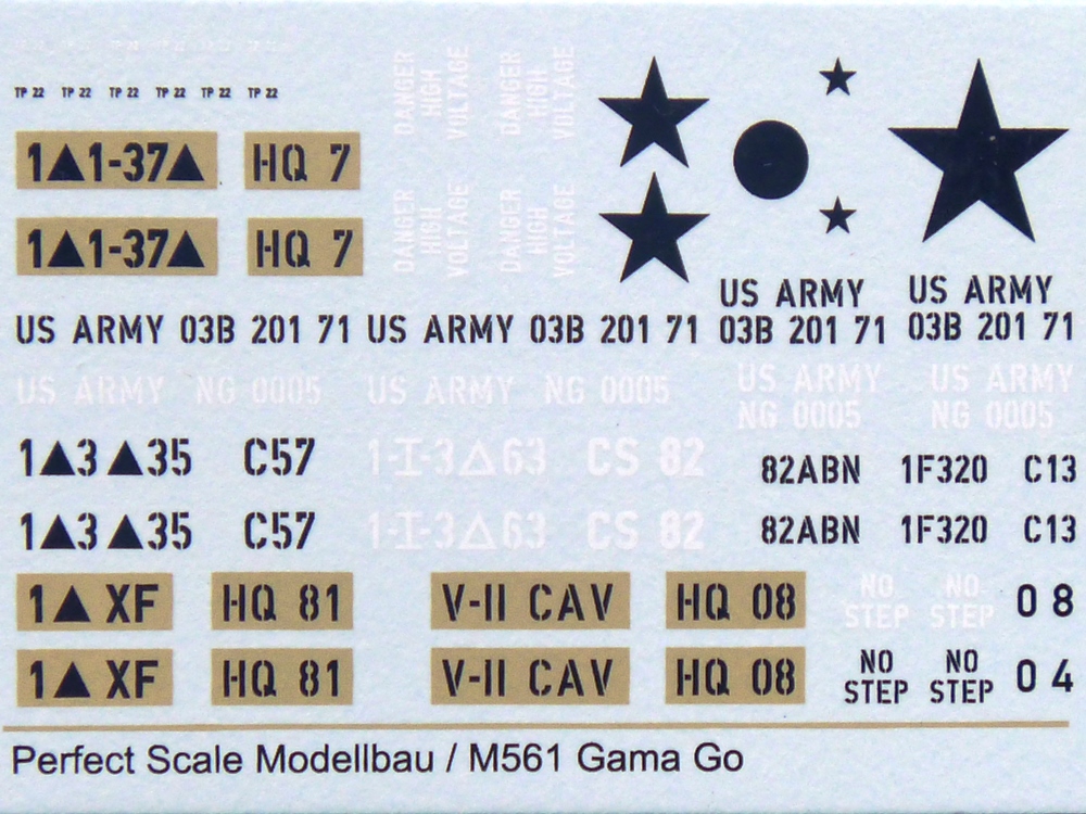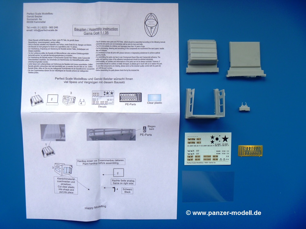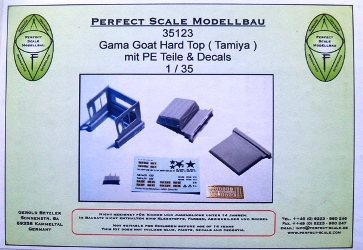 Das Original: Der M561 Gama Goat (offizielle Bezeichnung: M561, 6×6 tactical 1-1/4-ton truck) war ein speziell für die in Vietnam vorgefundenen Verhältnisse entwickeltes Transportfahrzeug. Es war extrem geländegängig und bedingt schwimmfähig. Der Umbausatz: Tamiyas Gama Goat kommt in der Basiskonfiguration daher. Deswegen wird es die Modellbauer freuen, dass Perfect Scale nun einige Umrüstsätze bietet, mit denen man seinen M561 erheblich verändern kann. Ein weiteres Set liefert uns die Hard-Top Version. Im stabilen Karton finden wir 5 Resinteile, 1 Ätzteilplatine, eine Klarsichtfolie und einen Decalbogen. Resin: