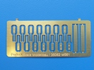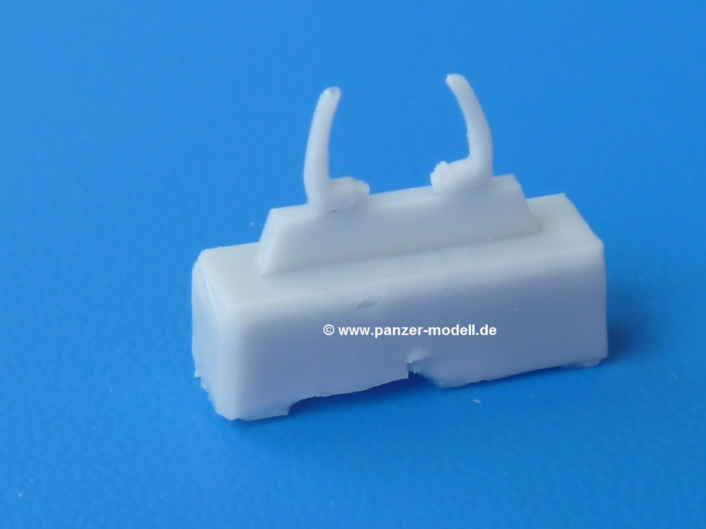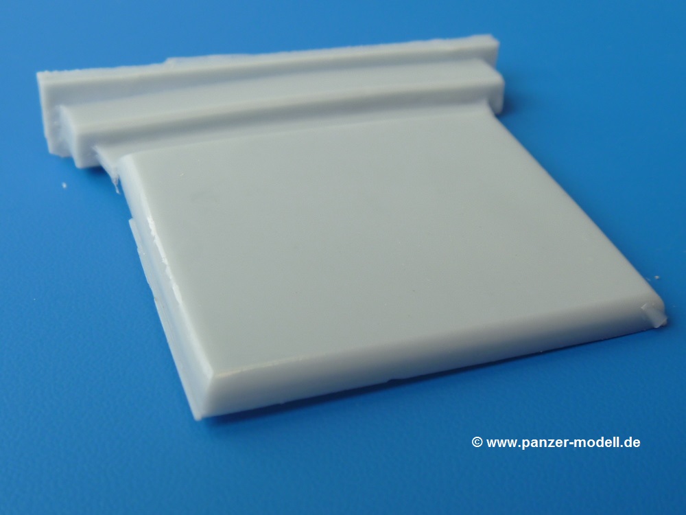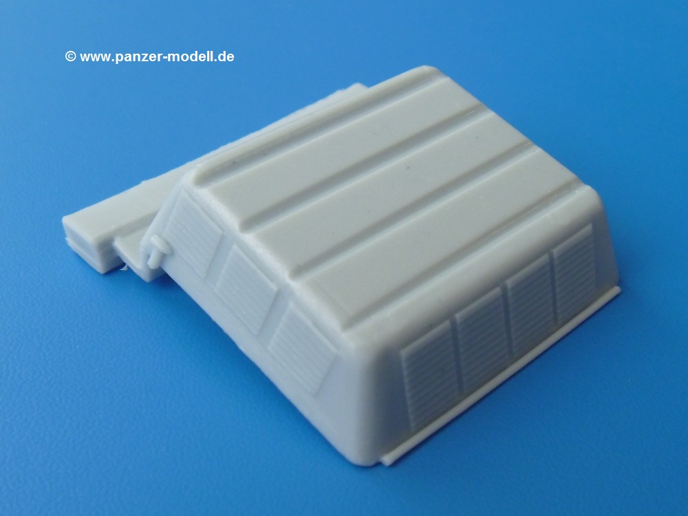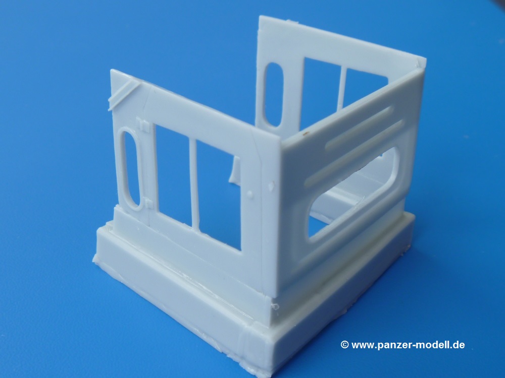 Alle Resinteile sind frei von Verzug und Blasen. Das Dach für den Fahrerraum ist recht stabil. Außer dem Abtrennen vom Angussstück benötigt es keine weitere Nacharbeit. Die 3 Seiten der Fahrerkabine werden in einem Stück geliefert. Die Wände sind angenehm dünn mit Fensteröffnungen, Verstärkungsrippen und Scharnieren. Auch hier besticht der saubere Guss. Die beiden Türgriffe findet man an einem separaten Gussstück. Als Ersatz für die eckige Motorabdeckung von Tamiya enthält der Karton eine Version mit abgerundeten Kanten und Verstärkungsrillen auf dem Dach. Aus der glasklaren Folie schneidet man die 7 Fenster der Fahrerkabine aus. Die Ätzteilplatine liefert 14 Spannhaken für den Anhänger - je 5 an den Seiten und je 2 für Vorder- und Rückseite. Der Decalbogen enthält verschiedene Fahrzeugmarkierungen in schwarz, weiß oder scharz auf sandgelben Untergrund. Dazu kommen Beschriftungen wie "Danger High Voltage", "No Step" und "TP 22". Angaben zu den Einheiten oder zur Anbringung gibt es leider nicht. Die Tamiya Bauanleitung, bzw. Originalquellen sollten da weterhelfen können. Sicherlich ein absoluter Hingucker mit dem Hard-Top. Für um die EUR18,50 kann man das Set im deutschen Handel erstehen. |