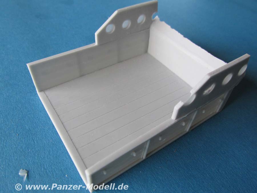 Die Ladefläche mit Seitenwänden sieht ebenfalls sehr gut aus mit der Struktur der Bretter. Der Unterboden ist recht detailliert mit der Achse, der Achsenaufnahme, sowie des Halterungsgestells für den Ersatzreifen, sowie des Ersatzreifens an sich. Natürlich sind auch die beiden Reifen der Achse auch sehr gelungen - schöne Felge und feines, sauberes Profil.