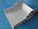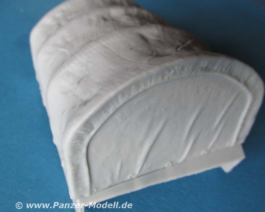 Der Anhänger setzt sich im Groben aus der Ladefläche mit angegossenen Seitenwänden, der Bodenplatte, Achshalteungen, Achse und Plane zusammen. Allein die Plane, die in einem Teil gegossen ist, sieht phänomenal gut aus. Es handelt sich um die Rundplane des Anhängers und zeigt eine wudnerschöne Faltenstruktur und die durchdrückenden Spriegel - die Rückseite ist offen, sodass man in den Anhänger hineinsehen kann.